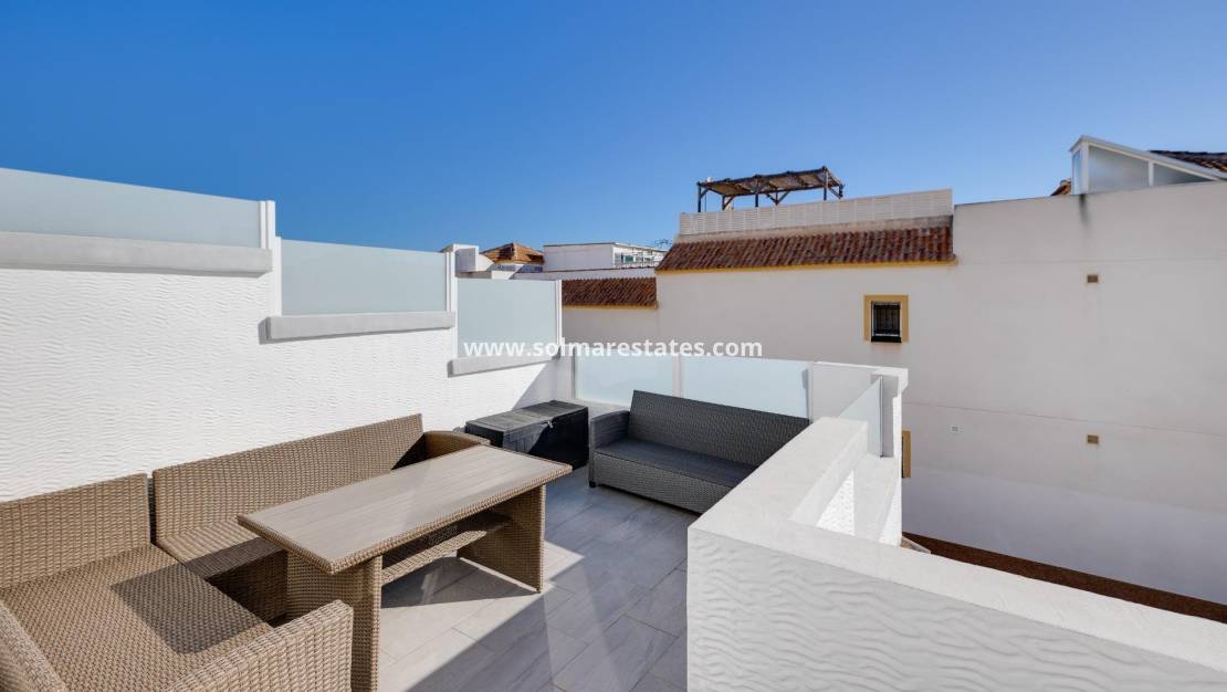 Au premier étage, vous trouverez une grande terrasse idéale pour se détendre, ainsi qu'un accès à un solarium privé sur le toit offrant une vue imprenable, parfait pour profiter du soleil toute l'année.