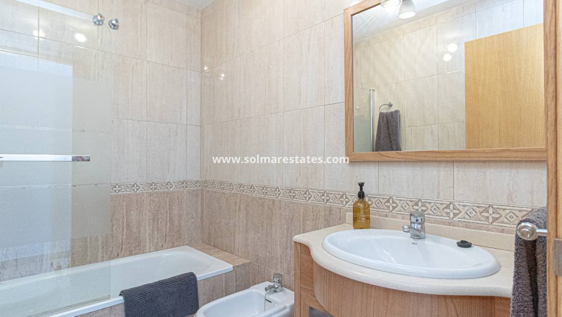 Cette propriété offre deux chambres doubles spacieuses avec placards intégrés, toutes deux situées au premier étage. La chambre principale bénéficie d'un balcon privé ensoleillé exposé sud-ouest, avec accès direct à une vaste terrasse sur le toit. De là, vous profiterez d'une vue dégagée sur la mer Méditerranée à l'avant et sur la piscine et les jardins communs à l'arrière : un espace idéal pour se détendre, bronzer ou recevoir, avec un barbecue intégré en briques. Une salle de bains familiale complète l'étage.