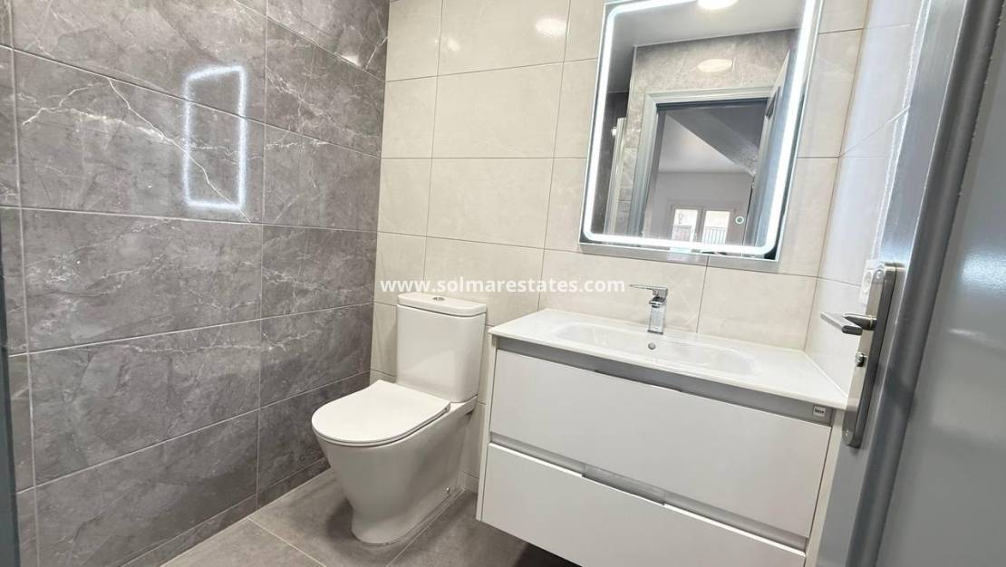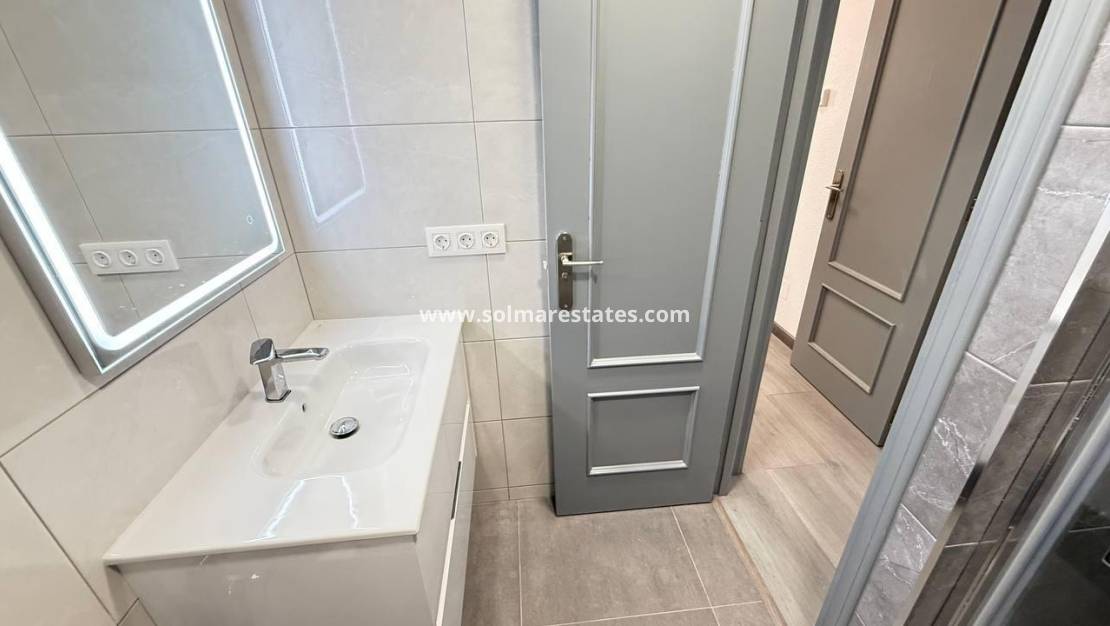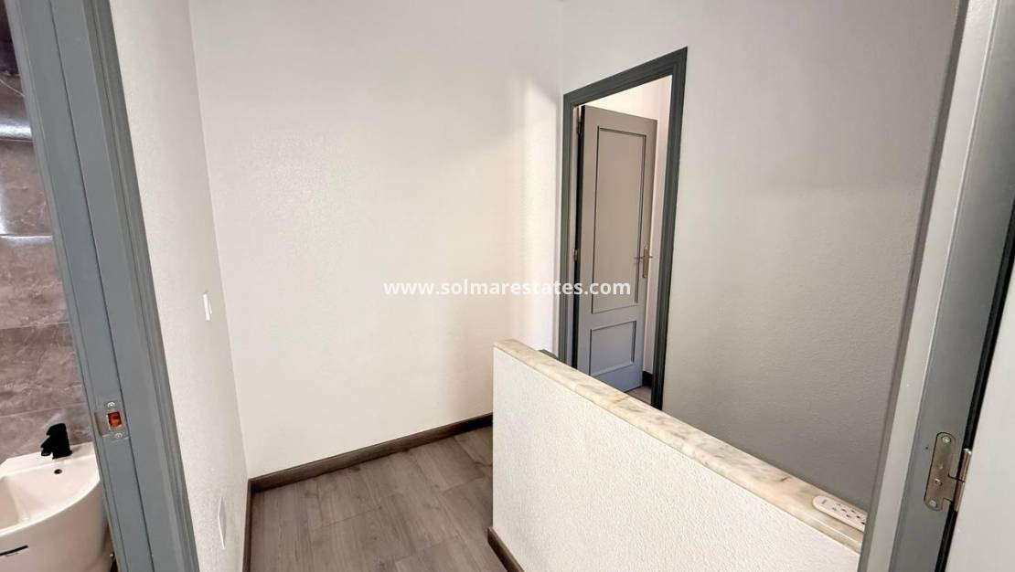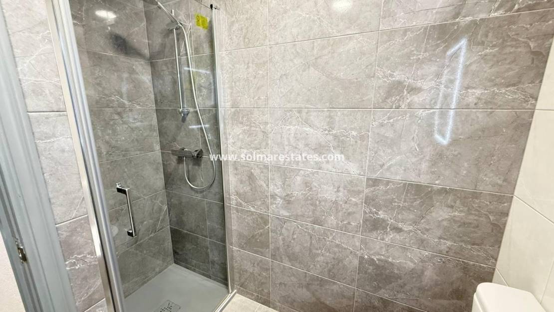 Op de eerste verdieping bevinden zich 2 slaapkamers met tweepersoonsbed, beide met inbouwkasten en warme en koude airconditioning. De hoofdslaapkamer heeft een klein balkon en 1 nieuwe badkamer met douche.