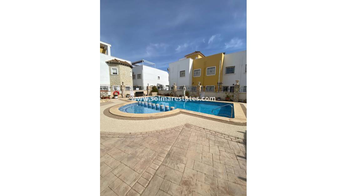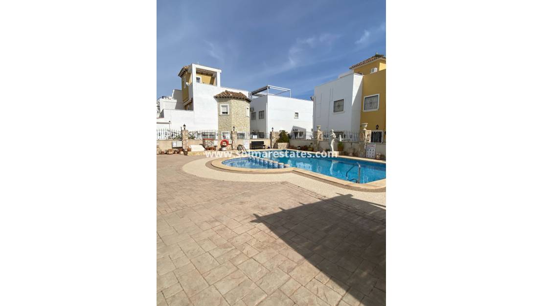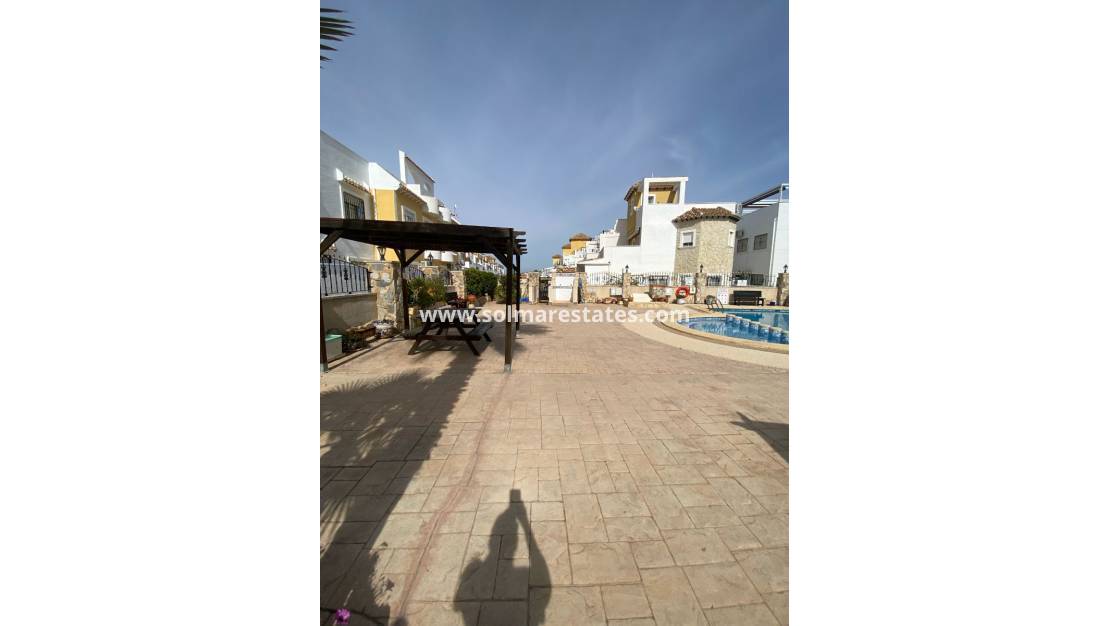 Buiten is er een terras aan de voorzijde, een voortuin en een gemeenschappelijk zwembad.