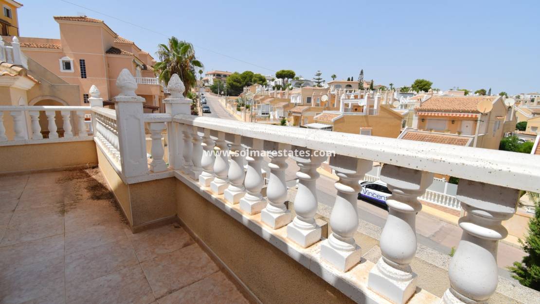 Een ruime halfvrijstaande woning met drie slaapkamers in El Galan, gelegen op 10 minuten lopen van diverse restaurants en cafés. Ook een supermarkt en een winkelcentrum van een bekende keten zijn vlakbij. Golfliefhebbers kunnen kiezen uit drie topbanen binnen 10 minuten rijden, en het populaire winkelcentrum La Zenia Boulevard en de prachtige stranden liggen op slechts 10 minuten afstand. De villa is bereikbaar via een trap naar een overdekt terras, dat uitkomt in een lichte woon-/eetkamer met een charmante open haard. De ingerichte keuken heeft een deur die toegang geeft tot een patio. Op deze verdieping bevinden zich ook een tweepersoonsslaapkamer en een badkamer met douche. Op de eerste verdieping bevinden zich nog twee tweepersoonsslaapkamers, beide met een eigen terras, en een familiebadkamer. De buitenruimte omvat betegelde parkeergelegenheid op eigen terrein, een voortuin, een betegeld terras aan de achterzijde met een kiezelrand en toegang tot een goed onderhouden gemeenschappelijk zwembad. Extra voorzieningen zijn onder andere plafondventilatoren en inbouwkasten in alle slaapkamers. Dit pand ligt op een gewilde locatie aan de Costa Blanca Zuid en biedt een fantastische combinatie van comfort, gemak en goede bereikbaarheid van voorzieningen, golfbanen en de kust.
