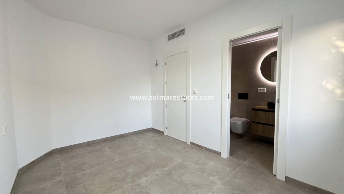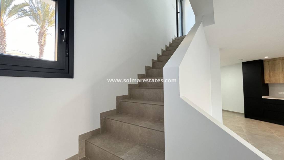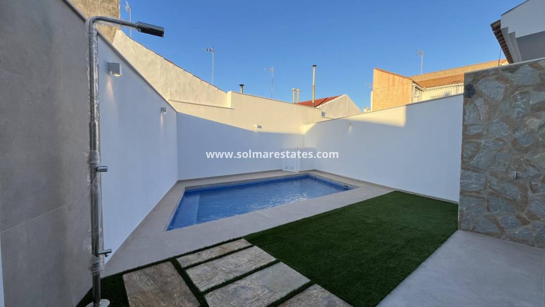 Sleutelklare nieuwbouwwoning met privézwembad op slechts 500 meter van het strand in San Pedro del Pinatar Exclusieve nieuwbouw op een toplocatie aan de Costa Cálida Ontdek deze uitzonderlijke nieuwbouwvilla in San Pedro del Pinatar, op slechts 500 meter van het zandstrand van Villananitos. Deze sleutelklare woning biedt een perfecte mix van modern design, luxe afwerking en een ongeëvenaarde locatie aan de gewilde Costa Cálida in Spanje. Of u nu op zoek bent naar een vakantiehuis, een woning voor het hele jaar of een investering met een hoog rendement, deze villa voldoet aan alle eisen. Ruime indeling met moderne elegantie Deze villa ligt op een perceel van 240 m² en heeft een bebouwde oppervlakte van 145 m², verdeeld over twee verdiepingen. Het omvat: Drie ruime slaapkamers, waarvan één op de begane grond met een en-suite badkamer Twee complete badkamers met inloopdouches en hoogwaardige materialen Een gastentoilet op de begane grond Open keuken met hoogwaardige Bosch-apparatuur Grote en lichte woonkamer met direct uitzicht op het terras bij het zwembad Vier terrassen, ideaal voor buitenleven en entertainment Elke ruimte is ontworpen met het oog op comfort, elegantie en functionaliteit, met uitstekende isolatie en airconditioning voor een aangename temperatuur het hele jaar door. Privézwembad en buitenleven Geniet met volle teugen van het mediterrane leven met uw eigen privézwembad, buitendouche en meerdere terrassen om te zonnen, te lezen of buiten te eten. Moderne buitenverlichting versterkt de sfeer en maakt het perfect voor ontspannen avonden onder de sterren. Er is ook een eigen parkeerplaats op het perceel en een grote bijkeuken met aansluitingen voor een wasmachine, droger en een energiezuinig aerothermisch systeem voor warm water. Strategische ligging aan de kust Gelegen in San Pedro del Pinatar, een charmant stadje dat bekend staat om zijn authentieke Spaanse sfeer en moderne voorzieningen: Villananitos-strand – 0,5 km Dos Mares-winkelcentrum – 3 km Golfbaan Roda – 7 km Jachthaven Lo Pagán – 1,5 km Centrum van Murcia – 47 km Cartagena – 34 km Deze bevoorrechte locatie biedt gemakkelijke toegang tot stranden, golfbanen, winkels, restaurants en belangrijke vervoersverbindingen, waardoor het ideaal is voor zowel recreatie als dagelijks leven. Mis deze kant-en-klare kans niet Als u droomt van een stijlvolle, instapklare woning aan zee, dan is deze villa in San Pedro del Pinatar de perfecte keuze. Neem vandaag nog contact met ons op om een bezichtiging te plannen of meer informatie aan te vragen.