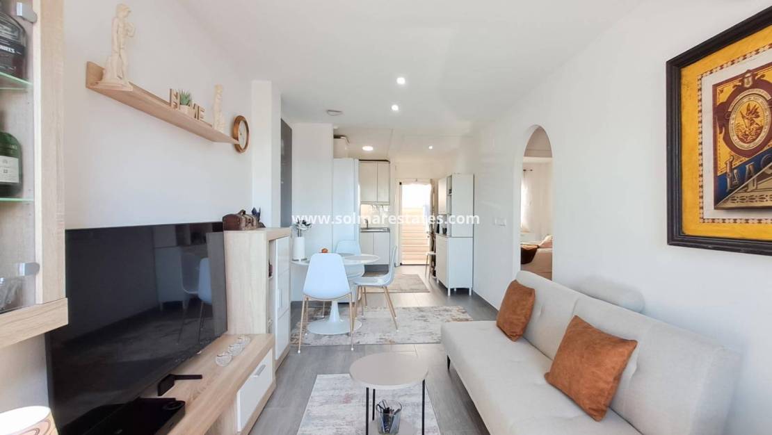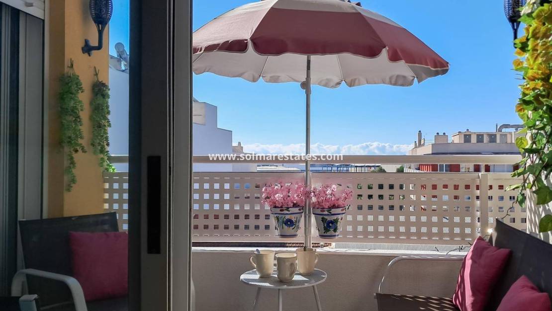 Open woon-/eetkamer met warme en koude airconditioning en toegang tot het balkon, een open keuken, 2 slaapkamers met tweepersoonsbed, beide met ingebouwde kasten en de hoofdslaapkamer met toegang tot het balkon, 1 nieuwe doucheruimte, privé solarium op het dak, een heerlijk gemeenschappelijk zwembad, lift, beveiligde community en nog veel meer.