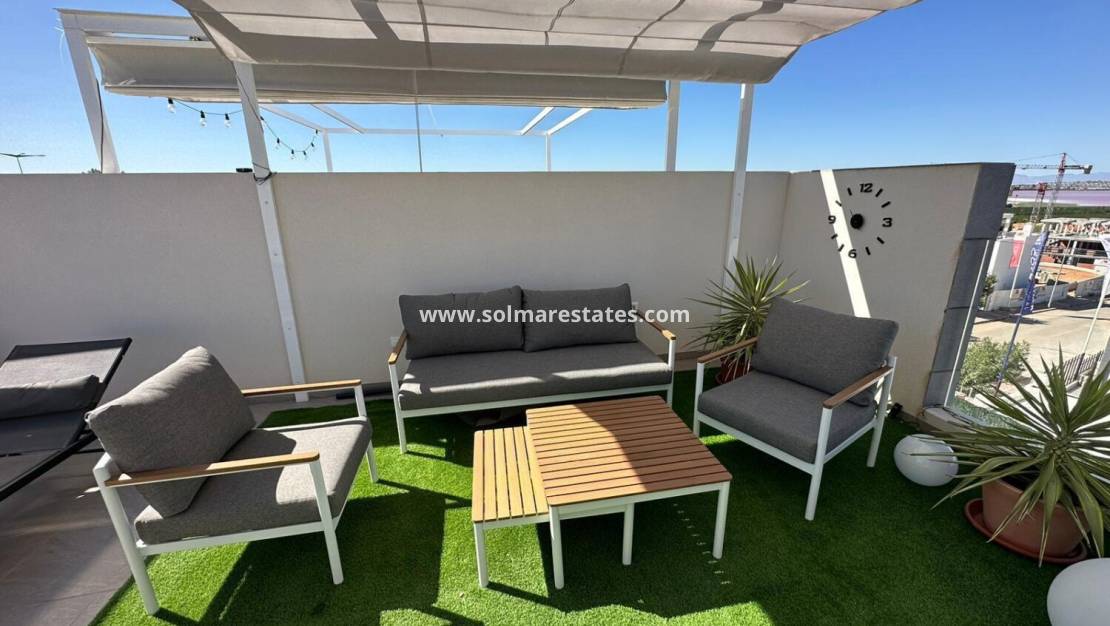 Woonkamer/eetkamer, open, volledig ingerichte keuken, 2 slaapkamers met inbouwkasten, de hoofdslaapkamer heeft een eigen badkamer met douche, 1 gastendouche, balkon, privé solarium op het dak, prachtig gemeenschappelijk zwembad, beveiligde community en nog veel meer.