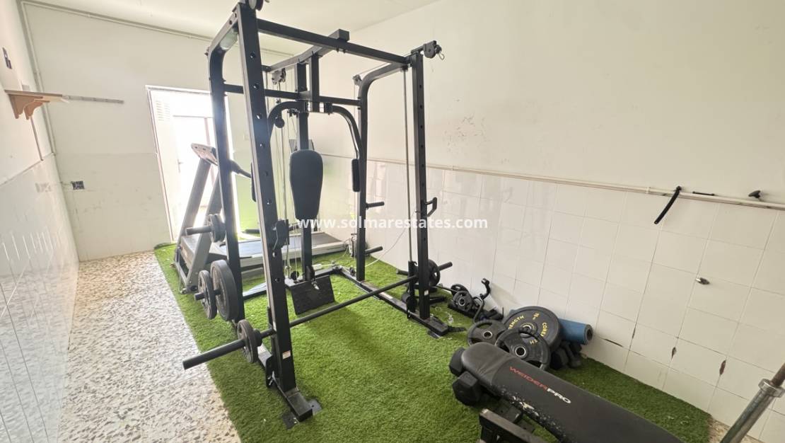 Garage omgebouwd tot fitnessruimte (makkelijk opnieuw te gebruiken indien nodig).