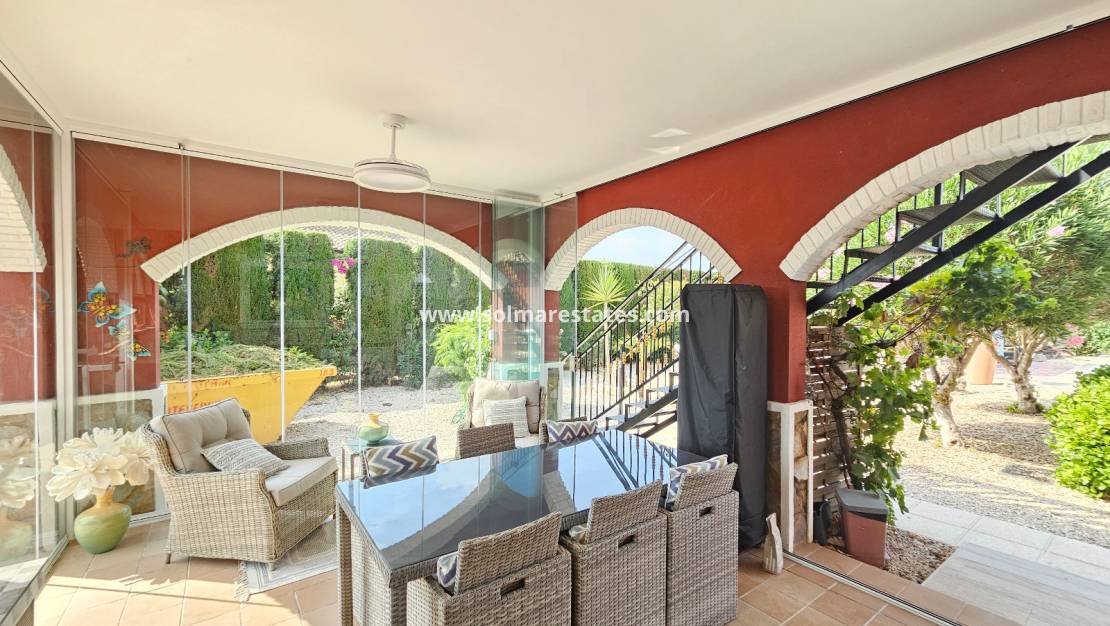 Afgesloten terras/eetgedeelte aan de voorzijde met dubbele beglazing.