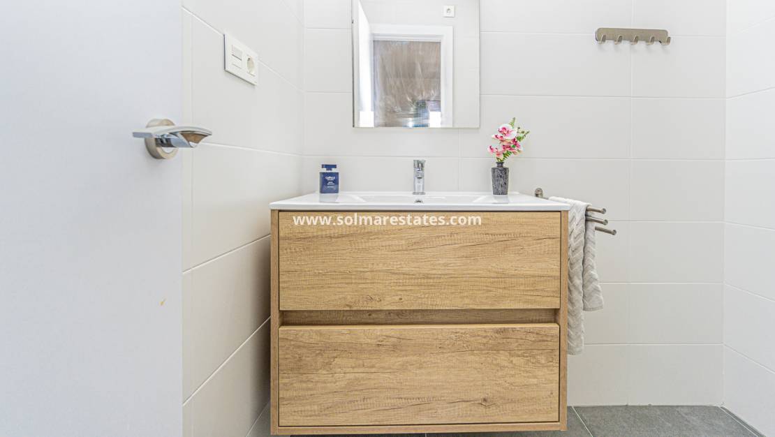 De indeling is zowel praktisch als uitnodigend. Rechts van de entree bevinden zich twee ruime slaapkamers met een prachtig uitzicht over de kloof van Campoamor en de golfbanen Las Ramblas en Campoamor – een perfecte setting voor natuur- en golfliefhebbers.