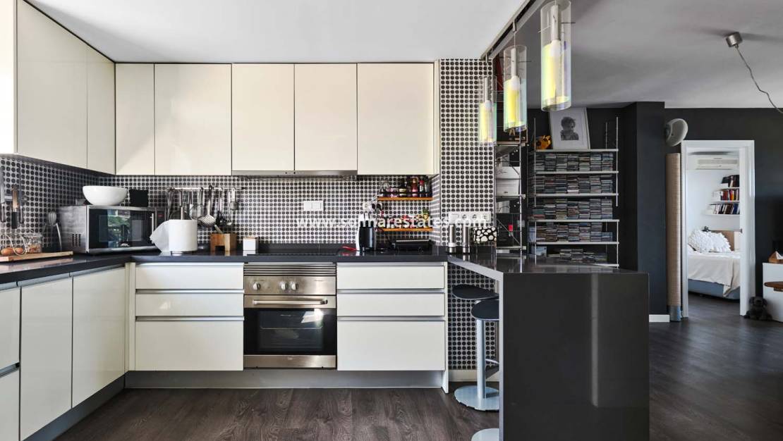 De hal leidt naar een moderne, volledig ingerichte keuken met veel opbergruimte, inbouwapparatuur, waaronder een wijnkoelkast, en een ontbijtbar, ideaal voor een informeel diner. De woon-/eetkamer is licht en ruim, met openslaande deuren naar een terras met zit- en eetgedeelte, een zonnescherm en een ononderbroken uitzicht op zee.