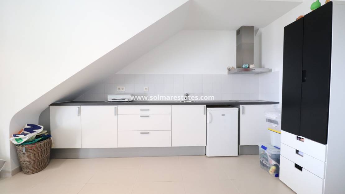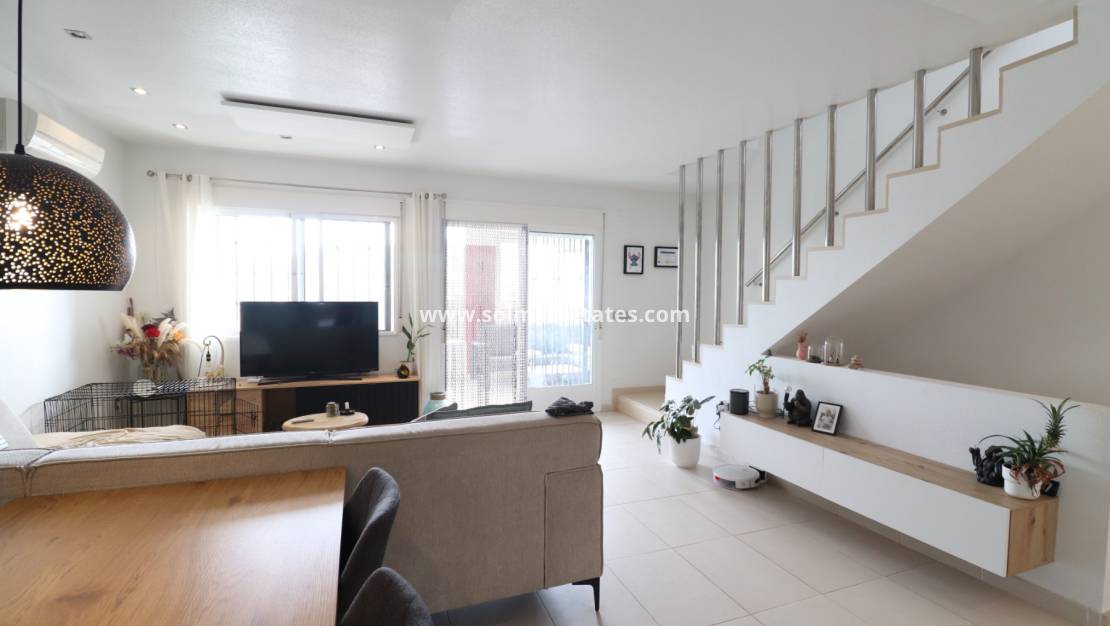 Op de eerste verdieping vindt u een lichte woon- en eetkamer met toegang tot een open terras, perfect voor een kopje koffie in de ochtend met prachtig uitzicht op de bergen. Op deze verdieping vindt u ook een aparte keuken, de hoofdslaapkamer met inbouwkasten en airconditioning, en een moderne badkamer met douche.