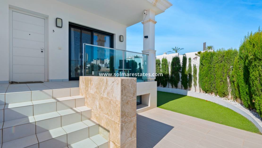Het interieur is zorgvuldig ontworpen met functionaliteit en comfort in gedachten. Op de begane grond sluit een ruime woonkamer naadloos aan op een moderne open keuken. Beide ruimtes komen direct uit op de privétuin – de perfecte plek om te genieten van uw ochtendkoffie of te dineren bij zonsondergang in de warme Spaanse bries. Op deze verdieping bevinden zich ook een gastentoilet en een praktische bijkeuken.