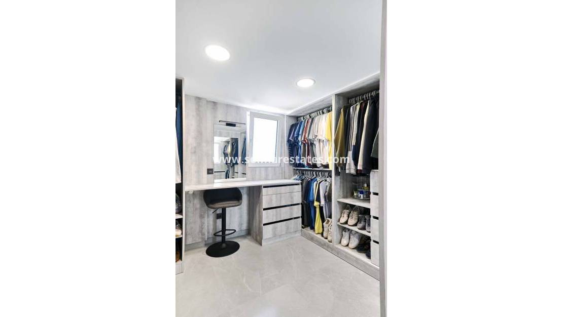 Een interne trap leidt vanuit de woonkamer naar de eerste verdieping. Bovenaan de trap vindt u een grote, op maat ontworpen inloopkast en kleedkamer, ontworpen door de huidige eigenaren. Aangrenzend bevindt zich de tweede familiebadkamer, eveneens met een grote inloopdouche. De hoofdslaapkamer is op deze verdieping compleet met airconditioning (warm/koud) en openslaande deuren naar een privé dakterras met prachtig uitzicht over het omliggende landschap.