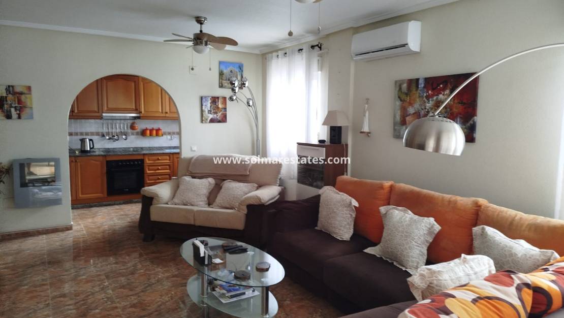 Binnen wordt u verwelkomd in een lichte, open woon- en keukenruimte. De keuken is volledig uitgerust met moderne apparatuur, terwijl de woonkamer is voorzien van airconditioning en plafondventilatoren voor comfort het hele jaar door.
