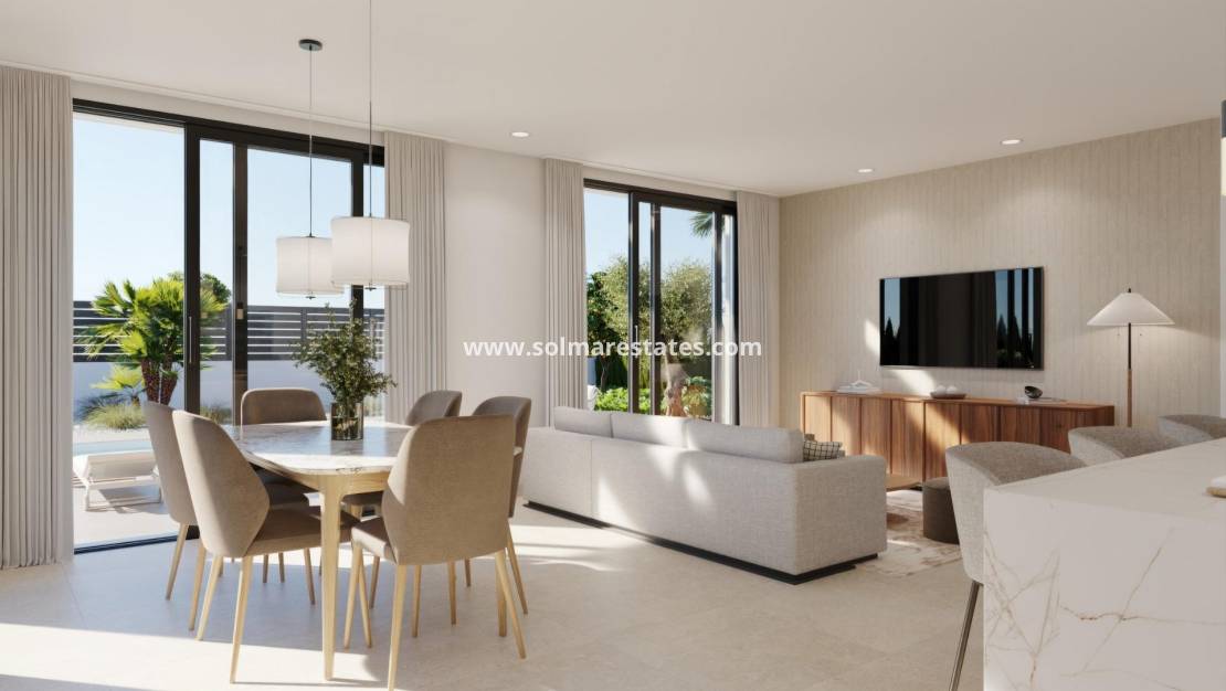 Nieuwbouwwoningen in Hacienda del Álamo Golf Resort, Murcia Moderne woningen in een natuurlijke en exclusieve omgeving Ontdek deze fantastische nieuwbouwwoningen in het prestigieuze Hacienda del Álamo Golf Resort, een gated community in de regio Murcia die rust, veiligheid en een compleet aanbod aan diensten combineert. Omgeven door natuur en met een bevoorrecht klimaat is dit complex ideaal voor wie op zoek is naar een ontspannen levensstijl zonder in te boeten aan comfort. Villas met 2 of 3 slaapkamers op één verdieping met privé-solarium De woonwijk bestaat uit 17 villa's op percelen vanaf 300 m2. U kunt kiezen uit woningen met 2 of 3 slaapkamers en 2 complete badkamers op één verdieping, naast een terras met privézwembad van 6x2,4 en een privé-solarium op het dak. Hoogwaardige afwerking en gegarandeerd comfort De woningen zijn ontworpen met hoogwaardige materialen en zijn bedoeld om energie-efficiëntie en welzijn te bieden: Buitenkozijnen met thermische onderbreking Warm water via een aerothermisch systeem Voorbereiding voor airconditioning via leidingen Privézwembad Onafhankelijke irrigatiewaterinstallatie met opslagtank en individuele drukgroep. Gemotoriseerde toegangspoort voor voertuigen. Gemotoriseerde rolluiken in slaapkamers Gepantserde voordeur Een resort met volledige service en golfbaan Hacienda del Álamo is een van de meest complete complexen aan de Costa Cálida. Het beschikt over: Professionele 18-holes golfbaan Hotel met spa Supermarkt Restaurants en bars Sportvelden en groene zones 24-uursbeveiliging De urbanisatie bootst de sfeer van een traditioneel mediterraan dorp na, met rustige straatjes en een verzorgd ontwerp. Strategische ligging dicht bij alles Internationale luchthaven van Murcia (Corvera): 20 km Extra golfbanen: minder dan 10 km Cartagena: 35 km Stranden van Mar Menor: 30 km Winkelcentrum Espacio Mediterráneo: 28 km Haven van Mazarrón: 40 km Leef in stijl aan de Costa Cálida Deze villa's bieden een uitstekende kans om te wonen of te investeren in een van de meest veelbelovende gebieden van Murcia. Neem nu contact met ons op en ontdek uw volgende thuis in Hacienda del Álamo Golf Resort.