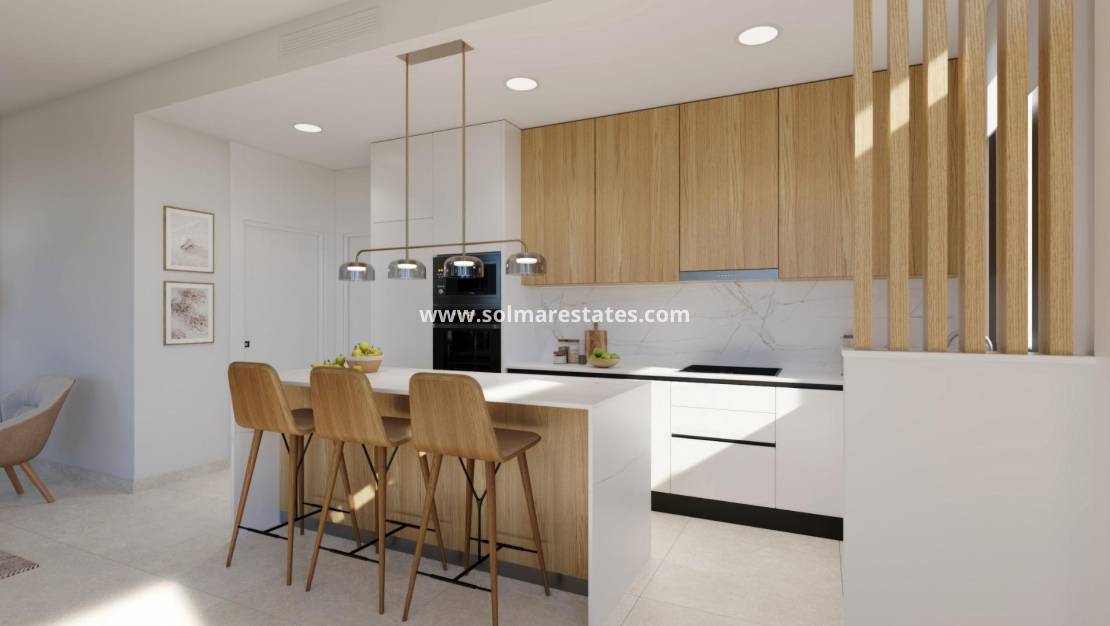 Nieuwbouwwoningen in Hacienda del Álamo Golf Resort, Murcia Moderne woningen in een natuurlijke en exclusieve omgeving Ontdek deze fantastische nieuwbouwwoningen in het prestigieuze Hacienda del Álamo Golf Resort, een gated community in de regio Murcia die rust, veiligheid en een compleet aanbod aan diensten combineert. Omgeven door natuur en met een bevoorrecht klimaat is dit complex ideaal voor wie op zoek is naar een ontspannen levensstijl zonder in te boeten aan comfort. Villas met 2 of 3 slaapkamers op één verdieping met privé-solarium De woonwijk bestaat uit 17 villa's op percelen vanaf 300 m2. U kunt kiezen uit woningen met 2 of 3 slaapkamers en 2 complete badkamers op één verdieping, naast een terras met privézwembad van 6x2,4 en een privé-solarium op het dak. Hoogwaardige afwerking en gegarandeerd comfort De woningen zijn ontworpen met hoogwaardige materialen en zijn bedoeld om energie-efficiëntie en welzijn te bieden: Buitenkozijnen met thermische onderbreking Warm water via een aerothermisch systeem Voorbereiding voor airconditioning via leidingen Privézwembad Onafhankelijke irrigatiewaterinstallatie met opslagtank en individuele drukgroep. Gemotoriseerde toegangspoort voor voertuigen. Gemotoriseerde rolluiken in slaapkamers Gepantserde voordeur Een resort met volledige service en golfbaan Hacienda del Álamo is een van de meest complete complexen aan de Costa Cálida. Het beschikt over: Professionele 18-holes golfbaan Hotel met spa Supermarkt Restaurants en bars Sportvelden en groene zones 24-uursbeveiliging De urbanisatie bootst de sfeer van een traditioneel mediterraan dorp na, met rustige straatjes en een verzorgd ontwerp. Strategische ligging dicht bij alles Internationale luchthaven van Murcia (Corvera): 20 km Extra golfbanen: minder dan 10 km Cartagena: 35 km Stranden van Mar Menor: 30 km Winkelcentrum Espacio Mediterráneo: 28 km Haven van Mazarrón: 40 km Leef in stijl aan de Costa Cálida Deze villa's bieden een uitstekende kans om te wonen of te investeren in een van de meest veelbelovende gebieden van Murcia. Neem nu contact met ons op en ontdek uw volgende thuis in Hacienda del Álamo Golf Resort.