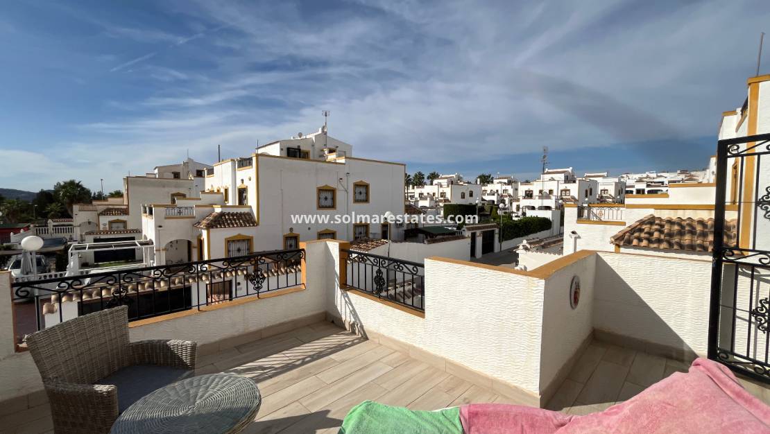 Een afgesloten interne trap leidt naar een privé dakterras met prachtig uitzicht op het gemeenschappelijke zwembad en park. De woning beschikt ook over een handige berging.