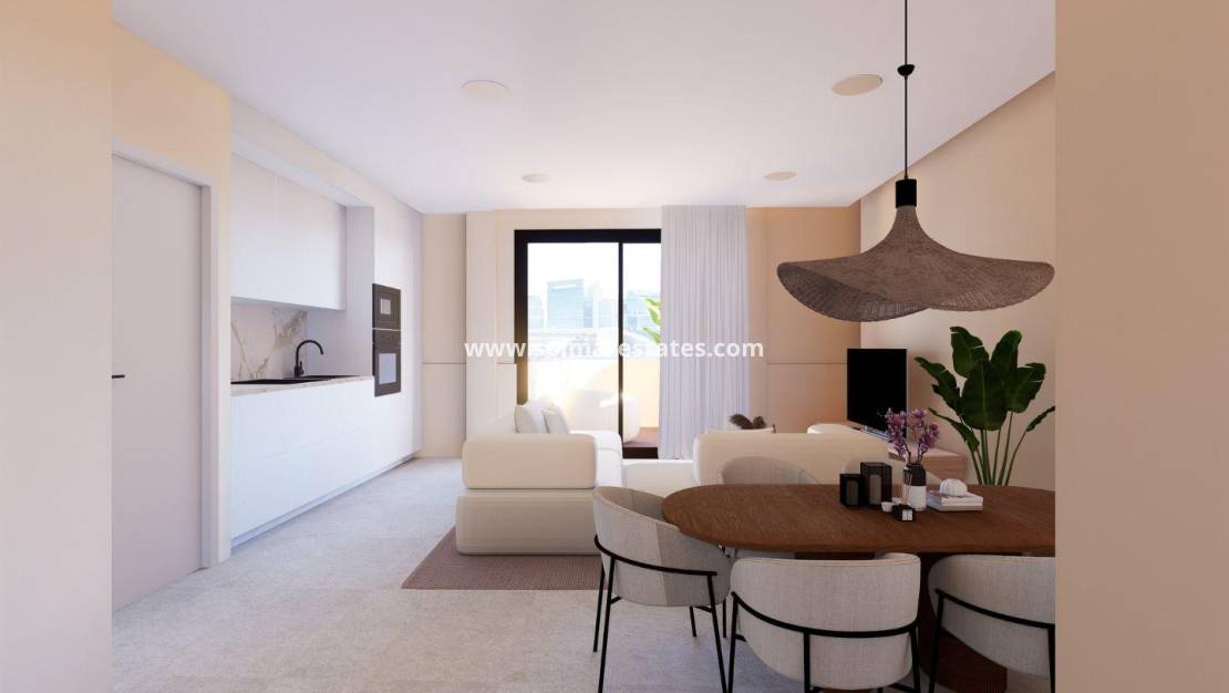 Nieuwbouwappartementen met uitzicht op zee in Muchavista, El Campello Exclusief wonen aan de kust, op een steenworp afstand van het strand Ontdek een boetiekwoongebouw op minder dan 200 m van het strand van Muchavista in El Campello, een van de meest gewilde kustgebieden aan de Costa Blanca Noord. Dit moderne project bestaat uit slechts 14 appartementen en penthouses met 2 en 3 slaapkamers, ontworpen om comfort, stijl en een sterke band met de mediterrane levensstijl te bieden. Muchavista staat bekend om zijn brede zandstrand, rustige sfeer en uitstekende voorzieningen, waardoor het ideaal is om er het hele jaar door te wonen of om er uw vakantie door te brengen. Modern ontwerp met ruime terrassen en uitzicht op zee Alle woningen zijn zorgvuldig ontworpen om het natuurlijke licht en het uitzicht op zee vanaf de bovenste verdiepingen te maximaliseren. De open indeling combineert de woon-eetkamer met een moderne geïntegreerde keuken, waardoor lichte en functionele ruimtes ontstaan. De appartementen op de begane grond hebben een eigen tuin, de woningen op de middelste verdieping hebben een terras met uitzicht op zee en de penthouses hebben een eigen dakterras, perfect om te ontspannen of gasten te ontvangen onder de zon van de Costa Blanca. Het architectonische concept geeft prioriteit aan strakke lijnen, een eigentijdse esthetiek en hoogwaardige materialen, wat zorgt voor duurzaamheid, comfort en een elegante afwerking in het hele gebouw. Hoogwaardige specificaties en energie-efficiëntie Elk appartement wordt opgeleverd met hoogwaardige voorzieningen die zijn ontworpen voor modern wonen. De woningen zijn voorzien van volledig geïnstalleerde airconditioning, elektrische rolluiken, een versterkte veiligheidsdeur en warmwatervoorziening via een efficiënt aerothermisch systeem. De keukens zijn volledig ingericht en uitgerust met apparatuur, waardoor ze een praktische en stijlvolle omgeving bieden voor het dagelijks leven. Bij elke woning hoort een parkeerplaats en een berging, wat extra gemak en waarde toevoegt. Energie-efficiëntie en duurzaamheid zijn belangrijke elementen in het ontwerp, die zorgen voor langdurig comfort en een lager energieverbruik. Gemeenschappelijke ruimtes ontworpen voor ontspanning De gemeenschappelijke ruimtes zijn ontworpen als een verlengstuk van uw woning. Bewoners kunnen genieten van een prachtig zwembad en aangelegde tuinen, die een rustige omgeving creëren op slechts enkele minuten van de zee. Deze gemeenschappelijke ruimtes zijn ideaal om te ontspannen, te socializen of gewoon het hele jaar door te genieten van het mediterrane klimaat. Toplocatie in El Campello Het strand van Muchavista ligt op minder dan 0,2 km van het project en biedt gemakkelijke toegang tot lange wandelingen, watersporten en restaurants aan zee. Het centrum van El Campello ligt op ongeveer 2 km afstand, terwijl het centrum van Alicante op ongeveer 12 km ligt. De internationale luchthaven Alicante Elche ligt op ongeveer 25 km. Verschillende golfbanen, zoals Alicante Golf, liggen op ongeveer 7 km afstand en de jachthaven van El Campello ligt op slechts 3 km afstand. Uw mediterrane thuis wacht op u Deze nieuwbouwappartementen in Muchavista bieden een uitzonderlijke kans om te genieten van uitzicht op zee, modern comfort en een uitstekende locatie aan de kust. Neem vandaag nog contact met ons op voor meer informatie of om een privébezichtiging te regelen en uw plek aan de Middellandse Zee veilig te stellen.