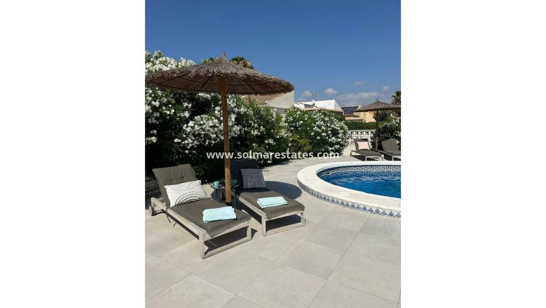 Elegante vrijstaande villa met 3 slaapkamers en 3 badkamers, gelegen op een privéperceel van 800 m² in het zeer gewilde El Chaparral / San Luis. Deze prachtig gerenoveerde woning combineert Scandinavisch design met klassieke Spaanse charme en biedt een licht en ruim interieur en veelzijdige woonruimtes, geschikt voor gezinsleven of het ontvangen van gasten.