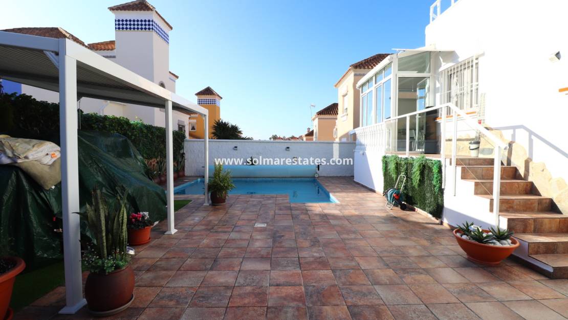 Deze indrukwekkende, op het zuidoosten georiënteerde vrijstaande villa met vier slaapkamers in Las Filipinas geniet een toplocatie met uitzicht op een rustig groen gebied met bomen en struiken, in een van de meest gewilde woonwijken aan de Costa Blanca Zuid.