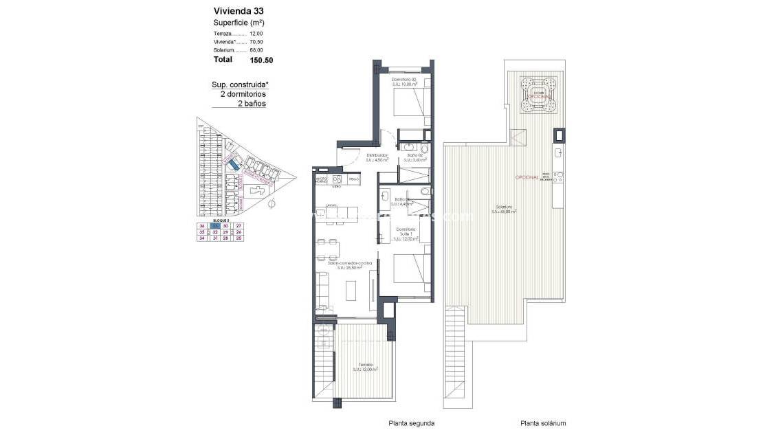 Nieuwbouw resortappartementen bij La Serena Golf-Los Alcazares vlakbij het strand Modern wonen aan de golfbaan aan de Costa Calida Ontdek dit exclusieve nieuwbouwresort bij La Serena Golf in Los Alcazares. Dit moderne project bestaat uit 66 stijlvolle appartementen met 2 of 3 slaapkamers en 2 badkamers, waarvan één en suite, ontworpen om comfort, elegantie en een uitzonderlijke mediterrane levensstijl te bieden op slechts 300 meter van de Mar Menor. Los Alcazares is een charmant kustplaatsje dat bekend staat om zijn ontspannen sfeer, zandstranden en lange boulevard. Met meer dan 300 dagen zon per jaar biedt de omgeving een perfecte omgeving voor buitenactiviteiten, watersporten en golf. Het stadje biedt ook een ruime keuze aan restaurants, winkels, jachthavens en sportfaciliteiten, waardoor het een zeer gewilde bestemming is voor zowel permanente woningen als vakantiehuizen. Appartementen met terrassen, tuinen en privésolaria Het wooncomplex biedt verschillende soorten woningen die passen bij verschillende levensstijlen. Kopers kunnen kiezen tussen appartementen op de begane grond met privétuinen, woningen op de middelste verdieping met ruime terrassen of penthouses met terrassen en grote solaria op het dak. De solariums zijn voorzien van een buitendouche en bieden de mogelijkheid om een zomerkeuken en een privéjacuzzi toe te voegen, waardoor een ideale ruimte ontstaat om te ontspannen en te entertainen terwijl u geniet van het open uitzicht op de golfbaan en het omringende landschap. Elke woning is ontworpen met een licht interieur en open leefruimtes die naadloos aansluiten op de buitenruimtes. Resortachtige voorzieningen en uitzonderlijke gemeenschappelijke ruimtes Een van de meest onderscheidende kenmerken van dit project is het resortachtige concept. Bewoners kunnen genieten van een spectaculair lagunezwembad van ongeveer 190 m2 met strandtoegang en ontspanningsruimtes met Balinese bedden. Extra gemeenschappelijke voorzieningen zijn onder meer aangelegde tuinen, een spa, een fitnessruimte en een sauna in de kelder. Het complex biedt ook een kinderspeelplaats, twee petanquebanen en gemeenschappelijke toiletten bij het zwembad, waardoor een gastvrije omgeving voor bewoners en gasten wordt gecreëerd. Hoogwaardige afwerking en moderne voorzieningen De appartementen zijn gebouwd met moderne materialen en hoogwaardige specificaties, ontworpen voor comfort en stijl. Volledig uitgeruste keuken met witglanzende apparatuur Badkamers met wastafels, doucheschermen en verlichte spiegels Gemotoriseerde rolluiken Basisverlichtingspakket Volledig geïnstalleerde airconditioning Ondergrondse parkeerplaats voor elke woning Ondergrondse fietsenstalling en optionele opslagruimtes Toplocatie dicht bij het strand en de golfbaan Mar Menor-strand 0,3 km La Serena Golf naast het project Centrum van Los Alcazares 2 km Cartagena 22 km Murcia 40 km Internationale luchthaven van Murcia 30 km Luchthaven Alicante Elche 90 km Het rustige en ondiepe water van de Mar Menor is het hele jaar door ideaal om te zwemmen, zeilen en paddleboarden. Verzeker uzelf van een woning in La Serena Golf Resort Deze moderne appartementen combineren wonen aan het strand, uitzicht op de golfbaan vanuit de meeste woningen en resortachtige voorzieningen in een van de meest aantrekkelijke gebieden van de Costa Calida. Neem vandaag nog contact met ons op voor meer informatie of om een bezichtiging te regelen en verzeker uzelf van uw nieuwe woning in La Serena Golf-Los Alcazares.