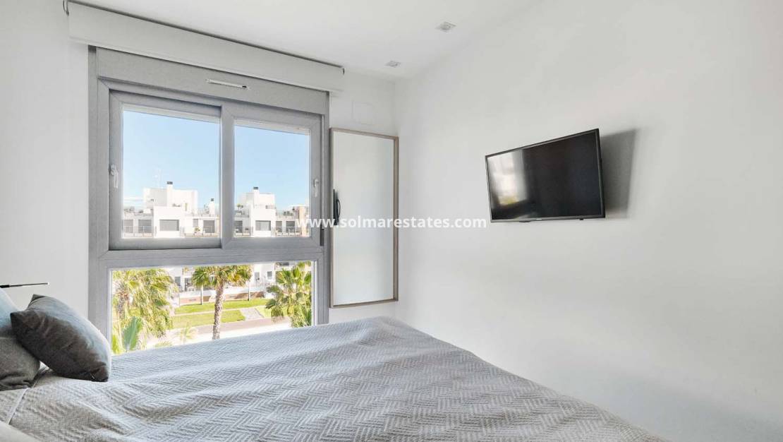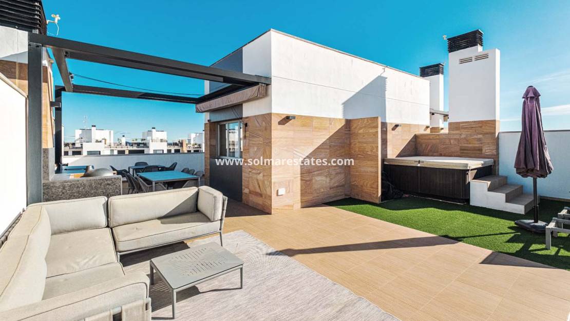 Pinar Properties presenteert met trots dit uitzonderlijke penthouse-appartement met drie slaapkamers en twee badkamers, gelegen in de zeer gewilde Bioko Deluxe-wijk in Cabo Roig. Dit appartement biedt een benijdenswaardige combinatie van luxe, comfort en een prachtig uitzicht op de Middellandse Zee, en ligt op loopafstand van bars, restaurants en andere voorzieningen.
