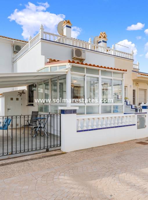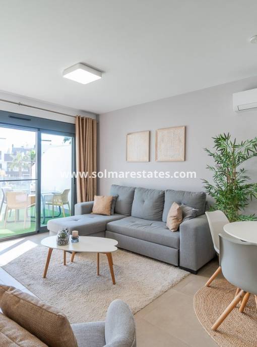 De tuinen en het solarium worden opgeleverd met de vloeren afgewerkt met een combinatie van kunstgras en een mooie bestrating die hout imiteert.