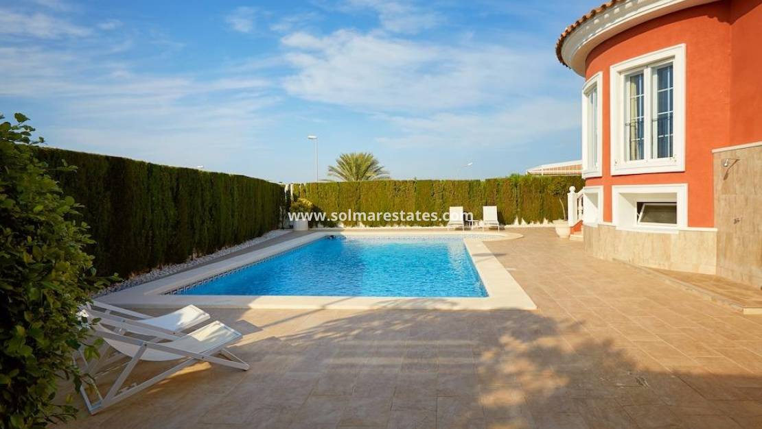 De buitenruimte is ontworpen voor luxe en ontspanning en beschikt over een zoutwaterzwembad van 5 x 10 meter, een geïrrigeerde tuin, een houten pergola met parkeerplaats en ligt vlakbij de gemeentelijke tennisbanen. Deze villa biedt een unieke combinatie van ruimte, stijl en praktische voorzieningen op een van de meest gewilde locaties in Ciudad Quesada.