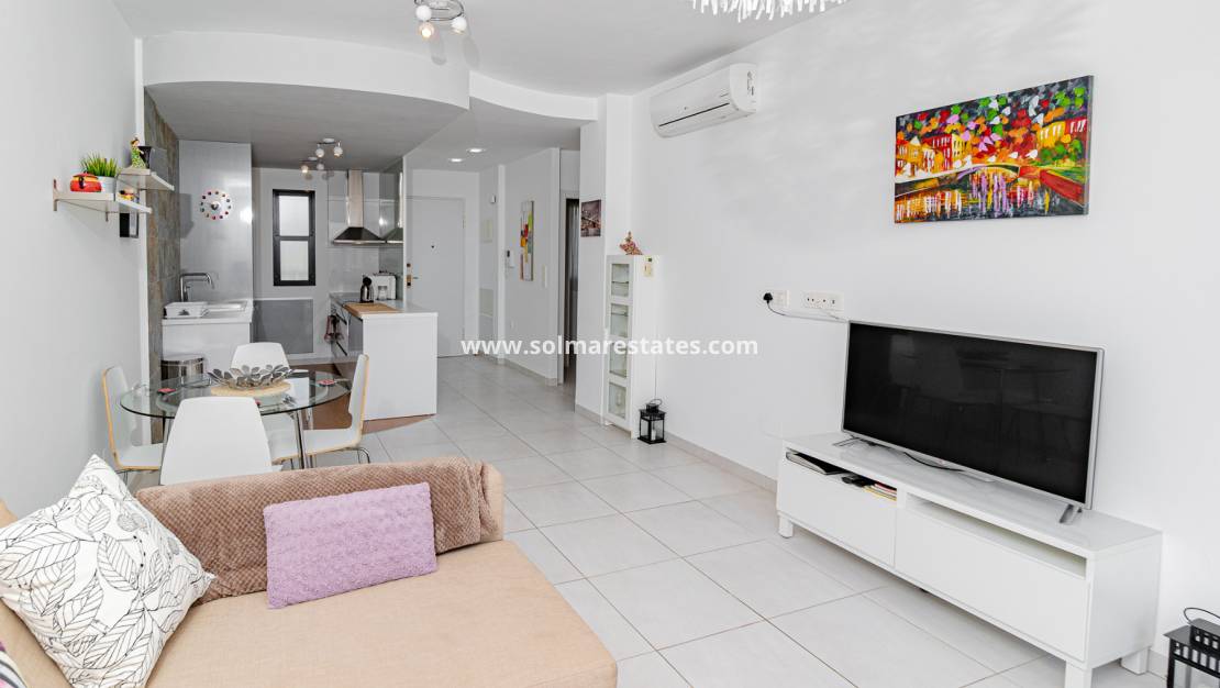 Deze woning, gebouwd in 2015 door een gerenommeerde projectontwikkelaar die bekendstaat om hoogwaardig vakmanschap en eersteklas materialen, biedt twee ruime slaapkamers en twee moderne badkamers, waaronder een en-suite badkamer bij de hoofdslaapkamer. De open woonruimte beschikt over een eigentijdse, volledig uitgeruste Amerikaanse keuken met ontbijtbar, die overgaat in een lichte woon- en eetkamer met grote ramen die toegang bieden tot het privéterras. Vanaf hier kunt u genieten van een prachtig uitzicht over het gemeenschappelijke zwembad en de aangelegde tuinen.