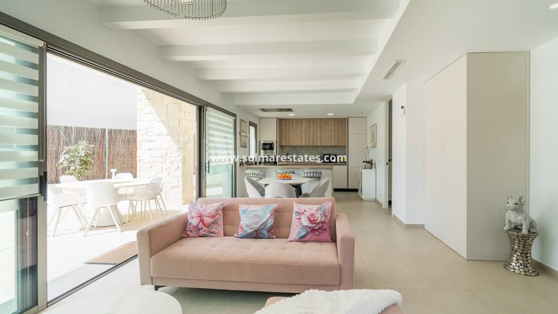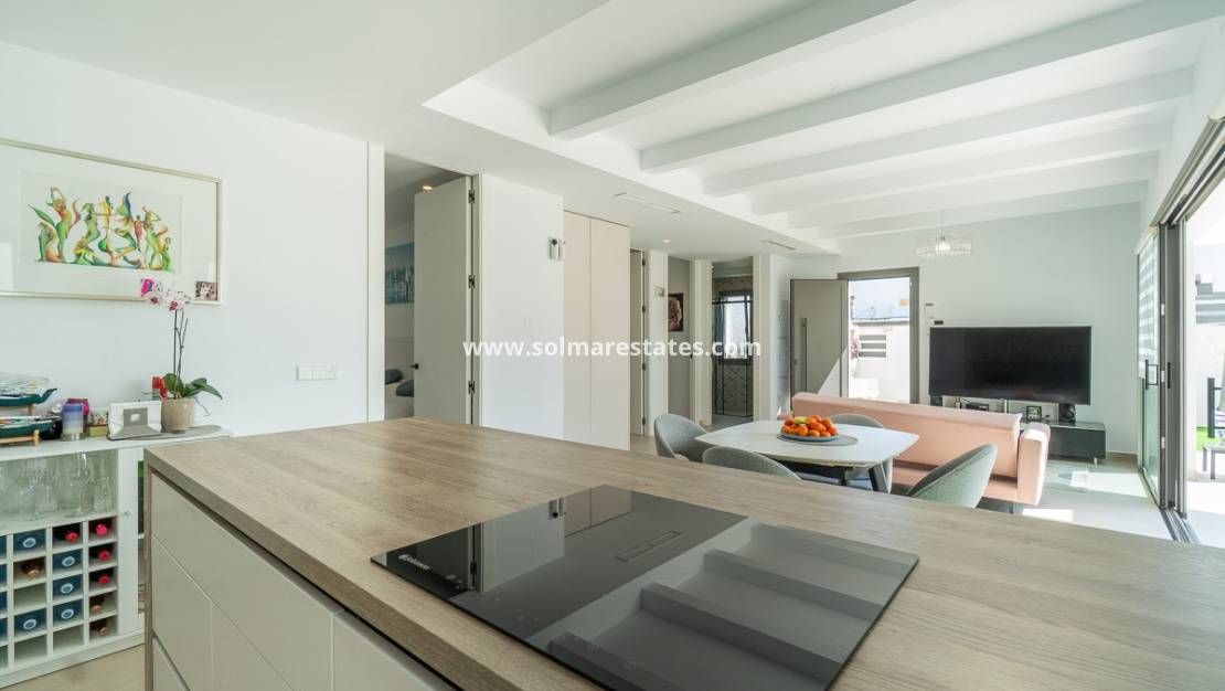 Ontdek deze moderne gelijkvloerse villa in de gewilde wijk Blue Lagoon in Villamartín, perfect gelegen tussen de bekende golfbanen van Villamartín en de populaire boulevard La Zenia .