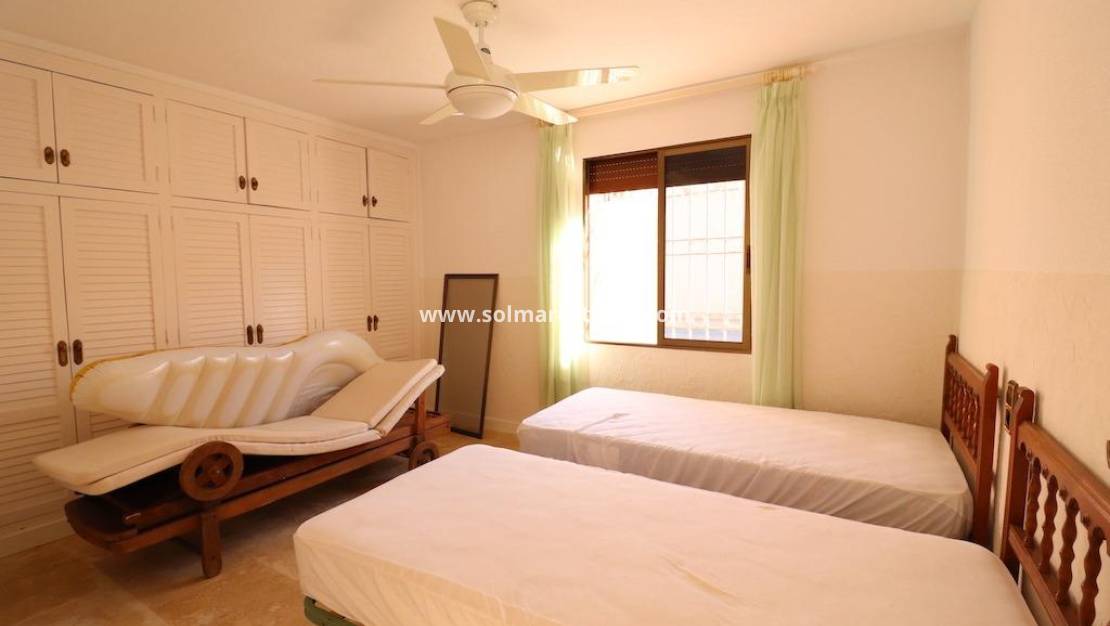 Cabo Roig, Detached villa on the corner of two streets with a 522 m2 plot and south-east orientation, and just 300 meters from Capitan beach, with a two-story house of 276 m2, the house has 5 bedrooms, 2 full bathrooms, 60m2 living room with fireplace, large independent kitchen, 8x3 pool with a barbecue area, large terrace in front of the house, sold furnished and with air conditioning and heating. Garage for 2 cars with pergola.~
