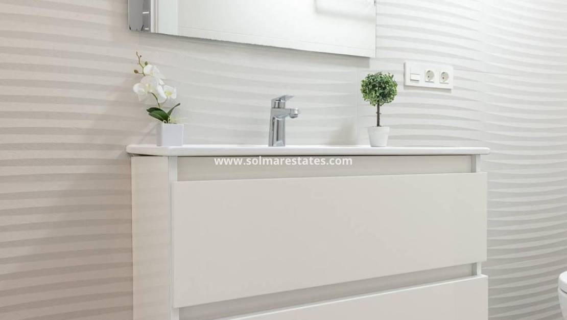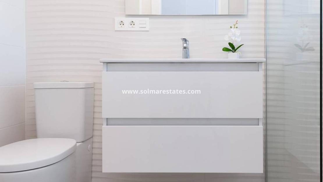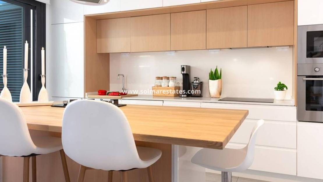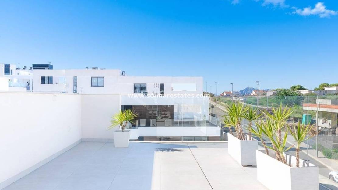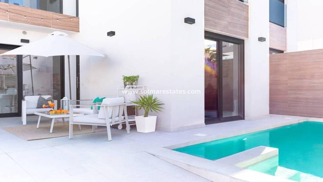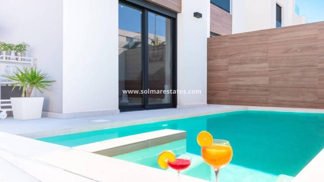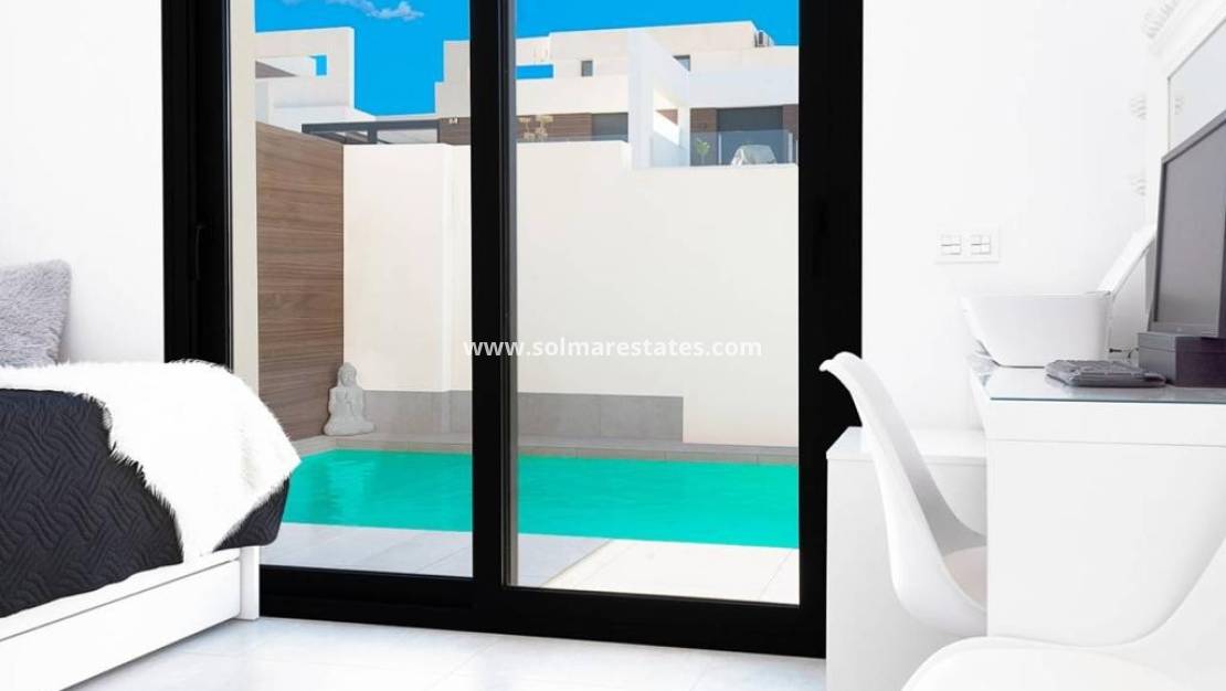 An East Facing, As New, Three Bedroom, Detached Villa with a Self contained Studio Apartment in Benijofar, which has it´s own access as well. Situated with the parkland bordering just a five—ten minute walk to the amenities Benijofar has to offer, including medical centre, school, bars, restaurants, McDonalds, shops, bank, supermarket, pharmacy and just a couple of minutes by car to a main chain supermarket, Quesada, Rojales and it´s La Marquesa Golf Course. The beaches along the coast can be reached in approximately ten minutes by car. This as new modern villa having a tourist licence, offers the opportunity of two excellent rental incomes, something that the current owner has made successful. The main villa offers bright open plan living; lounge/dining room with stairs leading up to the first floor; fitted kitchen with island unit and door leading out; utility room; family shower room; double bedroom with walk in wardrobe and sliding doors leading out to the pool area. On the first floor there are a further two double bedrooms with built-in wardrobes and en suite shower rooms, master with terrace; steps lead up to the private roof top solarium, where you can enjoy views across to the mountains. The garden is tiled with a private pool, BBQ area, car access. The self contained 70m2 studio apartment is accessed via another street, is open plan with a living area, fitted kitchen, open bedroom area and a shower room. The property benefits from ducted air con, the apartment having air con unit. This is totally, a one off opportunity not to be missed.