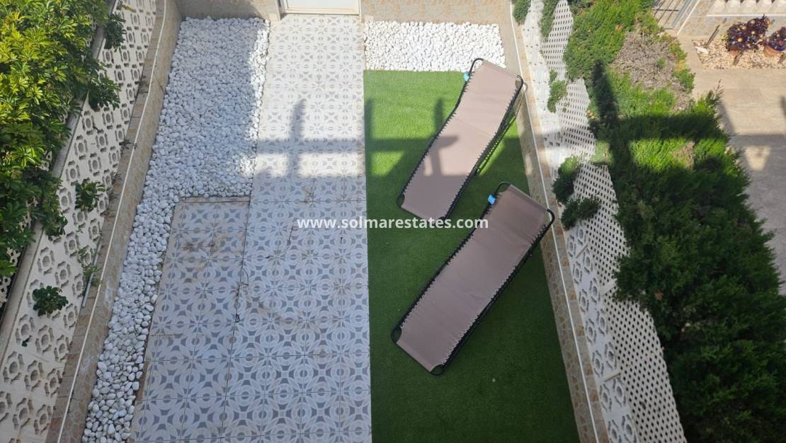 The property is located inside a gated community with parking, and has a garden to the front and rear, ensuring sun or shade at any time of the day. The front garden has an outdoor kitchen/BBQ and a cupboard housing the washing machine.