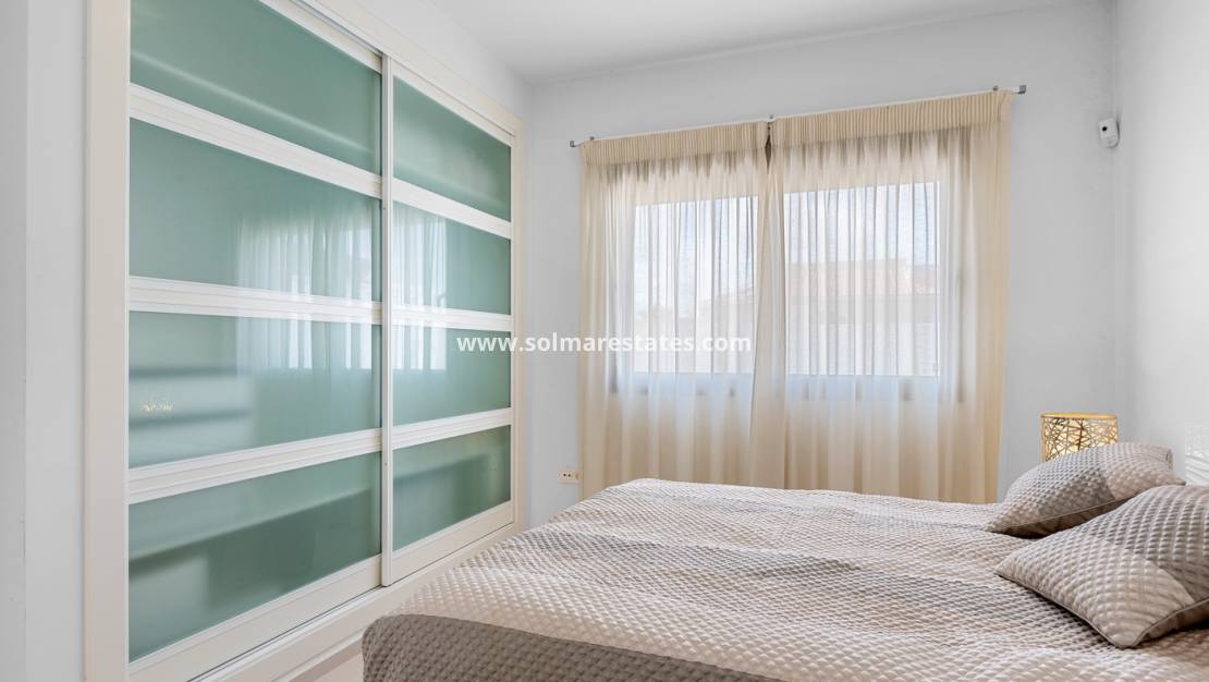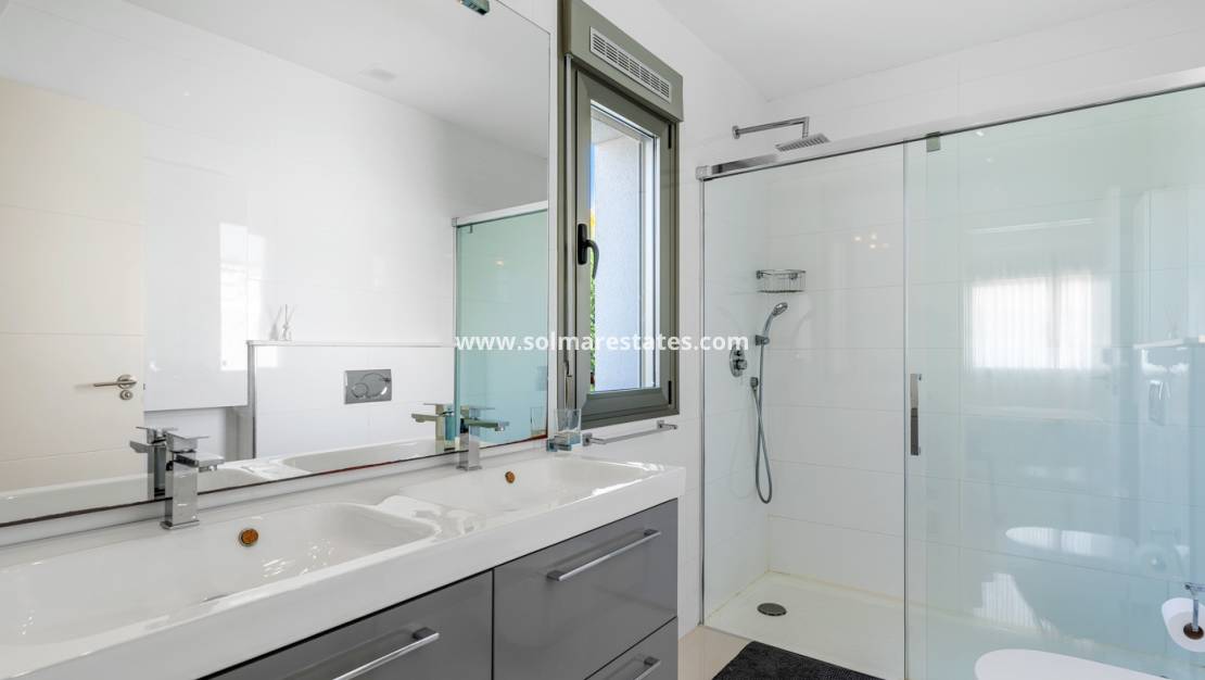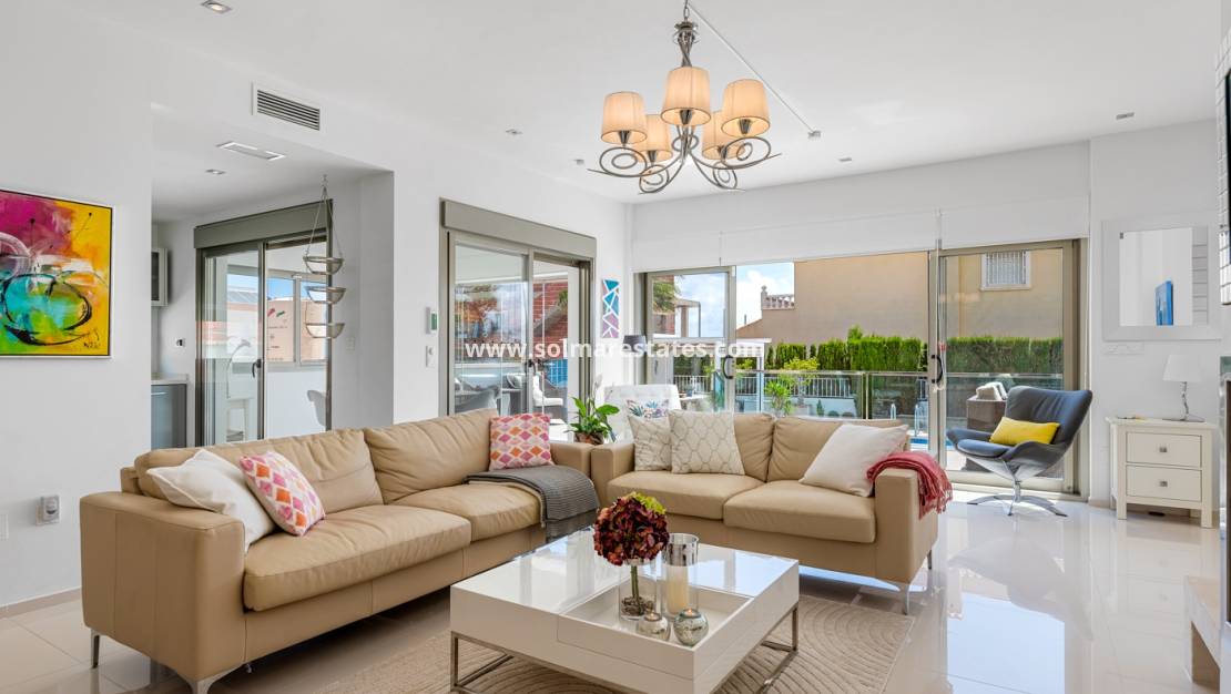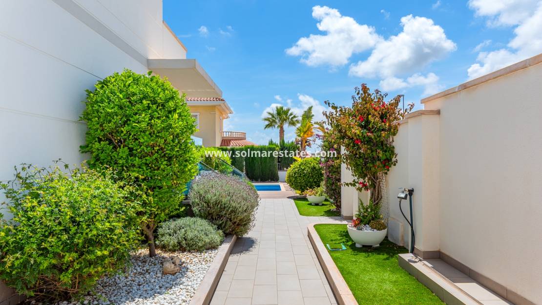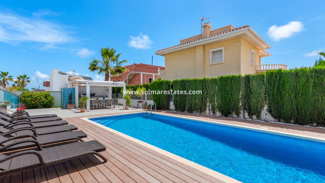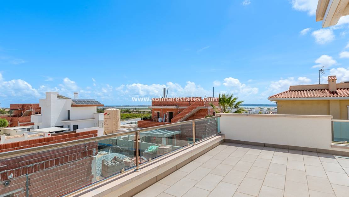 Outdoor areaThe villa is set on a south-facing plot of 500 m2. Here you can find a lovely swimming pool with space next to it for sun beds. At the end of the pool there is an outdoor kitchen / BBQ area with a covered dining table. There is also a lovely terrace facing the pool with access from the living room and dining room where you can find a lounge area. On the plot you can also find parking for one car (automatic gate) and a storage room. In the first floor there is a large terrace with beautiful views over the area and the salt lake of Torrevieja.