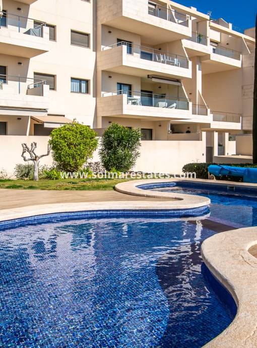 The property is comprised of a spacious lounge area, an open plan kitchen/dining area, electric shutters, air conditioning (hot/cold) throughout the property, a main bedroom with fitted wardrobes and en-suite bathroom, a further guest bedroom with fitted wardrobes and a second bathroom with walk-in shower. Patio doors lead out onto a private terrace (with small utility room) to enjoy the sun all day and there is a large rooftop terrace/solarium with amazing views. Private allocated parking space is also included.