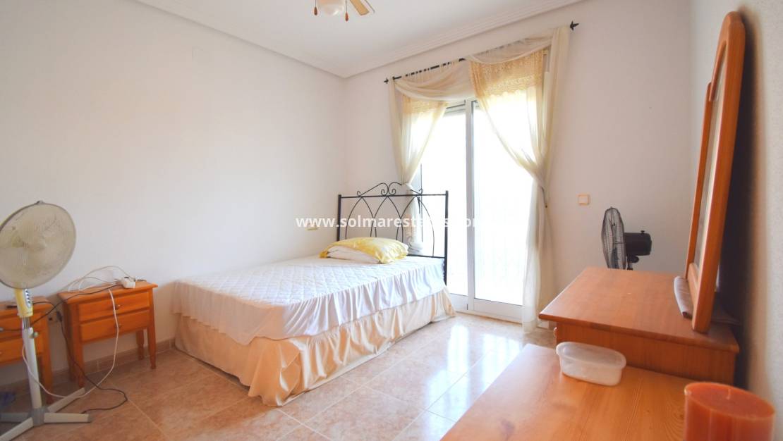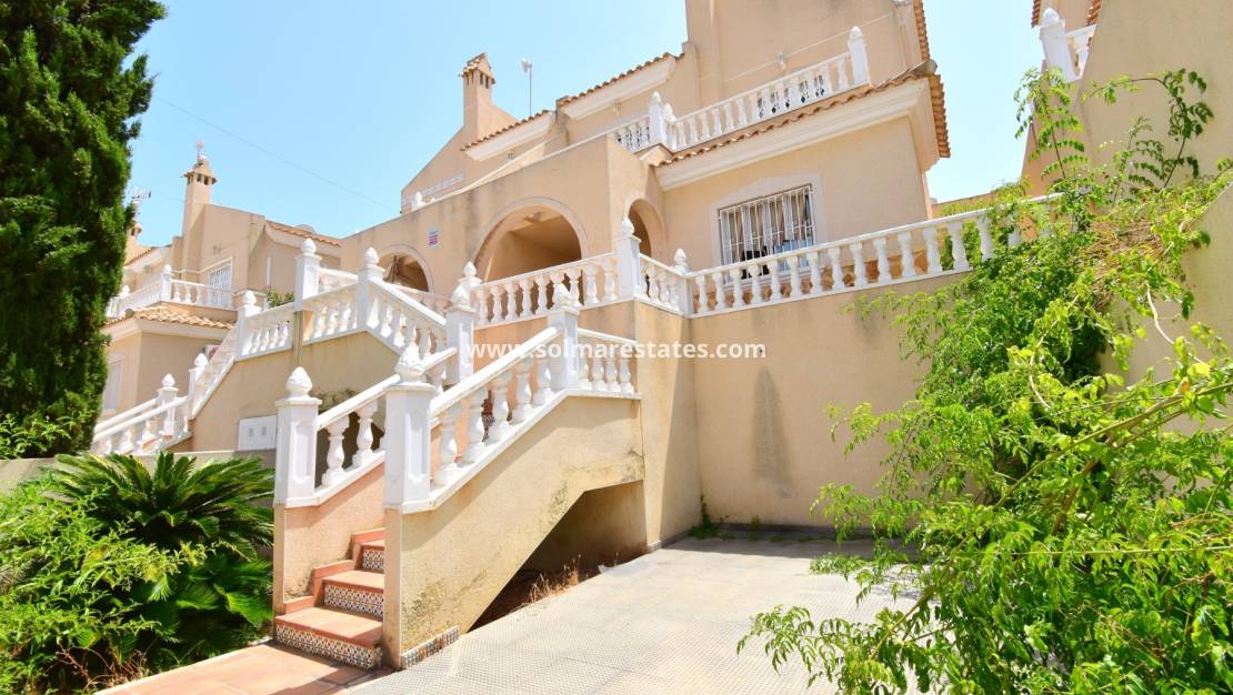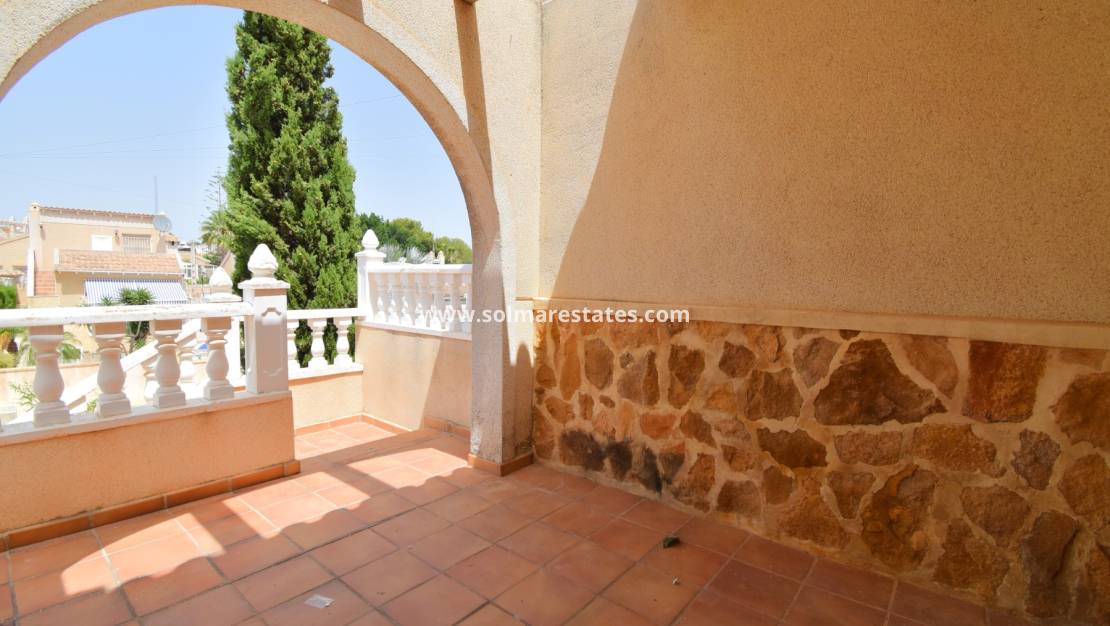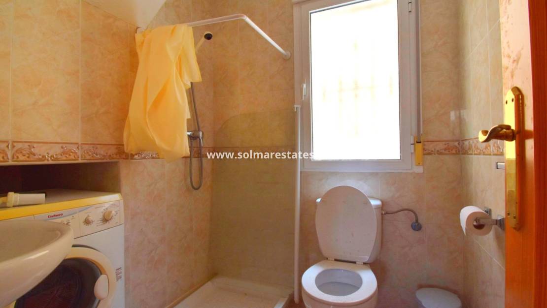 A Spacious, Three Bedroom, Semi Detachedhouse in El Galan, located within a 10-minute walk of a variety of restaurants and café bars, while a main chain supermarket and commercial centre are also conveniently close by. For golf enthusiasts, there is a choice of three top courses within a 10-minute drive, and the popular La Zenia Boulevard shopping centre and stunning beaches are just 10 minutes away. The villa is accessed via steps leading up to a covered entrance terrace, which opens into a bright lounge/dining room featuring a charming fireplace; the fitted kitchen has a door providing access to a patio. Also on this level, there is a double bedroom and a shower room. On the first floor, there are two further double bedrooms, both with their own private terraces, along with a family bathroom. The outdoor space includes tiled off-road parking, a front garden, a rear tiled patio area with a pebbled border, and access to a well-maintained communal pool. Additional features include ceiling fans and built-in wardrobes in all bedrooms. Situated in a desirable location on the Costa Blanca South, this property offers a fantastic combination of comfort, convenience, and accessibility to amenities, golf, and the coast.