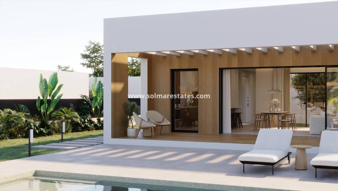 Modern Single-Storey Villas with Private Pool in Finestrat – Tranquility Meets Coastal Living Exclusive New Build Villas on Spacious Plots Discover an exclusive collection of 7 new build villas in Finestrat, each thoughtfully designed on a single floor with 3 bedrooms, 2 bathrooms, and 1 guest toilet. Set on generous plots of over 600 m², these properties offer an ideal blend of space, privacy, and elegance. Surrounded by lush Mediterranean landscaping and mountain views, these homes deliver a serene lifestyle just minutes from the vibrant coast of Benidorm. Elegant Design and Premium Outdoor Spaces Every villa is conceived as a peaceful oasis, featuring modern architecture and natural elements. The entrance welcomes you with a wide, elegant driveway and a covered carport. A landscaped garden filled with native plants and blooming trees sets the tone for a tranquil lifestyle. At the center of the home, a private courtyard adds charm and natural light, while the expansive garden includes a beautiful private pool surrounded by greenery and sunbathing areas. This outdoor sanctuary is perfect for entertaining or simply relaxing under the Mediterranean sun. High-Quality Finishes and Comfort These villas are built to high standards, with premium finishes and thoughtful features including: Double-glazed aluminium windows with thermal break for energy efficiency Fully equipped bathrooms with furniture, mirrors, and walk-in showers with screens Pre-installation for ducted air conditioning for year-round climate control Motorized vehicle access gate Private pool and landscaped garden Elegant modern kitchen and open-plan living space filled with natural light Prime Location in Finestrat, Close to Benidorm and the Coast Located in the picturesque town of Finestrat, these villas enjoy excellent connectivity to services and amenities: Beaches of Benidorm: less than 3 km La Marina Shopping Centre: 1 km Puig Campana Golf: 3 km Benidorm Old Town and entertainment area: 4 km Alicante International Airport: 55 km (approx. 40 minutes by car) Easy access to the A7 motorway for fast travel to Alicante, Valencia, and beyond This location offers the peace of a natural setting with quick access to shops, restaurants, golf courses, and the Mediterranean coast. Experience luxury, comfort, and nature in perfect harmony. Contact us now to schedule a visit or request more information about these unique villas in Finestrat.