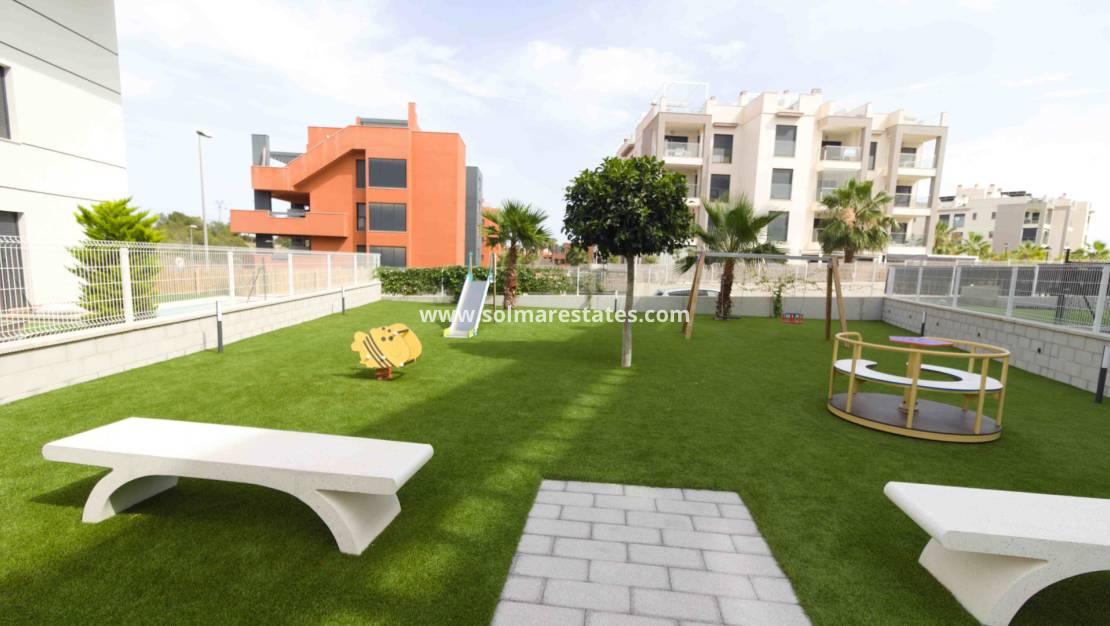 Light & airy lounge/diner with doors onto the covered terrace, front & side garden, open plan fully fitted kitchen, 1 x main bedroom with fitted wardrobes & an en-suite shower room, 1 x twin bedroom, 1 x family shower room, communal swimming pool, communal parking , lift, a children's play area & much much more.