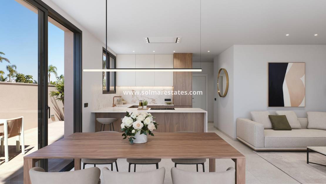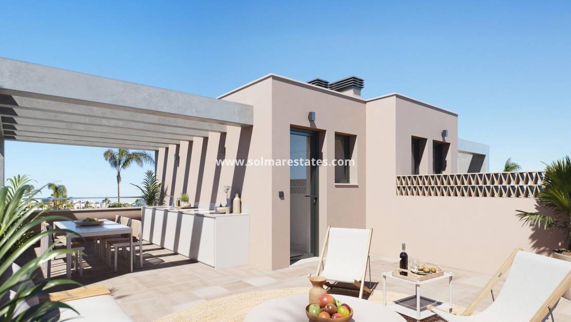 Exclusive residential development of 2 luxury semi-detached villas with sea views on Las Higuericas beach, Torre de la Horadada. Discover these impressive semi-detached homes located in Torre de la Horadada, on the second line of Las Higuericas beach. With a modern and elegant design, spacious rooms and top quality materials, these properties have been designed to offer maximum comfort and exclusivity. With a 5×3m private pool, parking on the plot and a 40 m2 solarium: a spectacular open space ideal for a chill-out area, barbecue or enjoying the sun and unobstructed views. Each villa has independent access from the surrounding streets, as there are no adjacent buildings. With quiet streets and large green areas around the residential complex, these properties are ideal for young families. The villas have a plot of 170 m2 and a built area of 135 m2. The villas are built with three bedrooms and three bathrooms (two of them en-suite) on two floors. The kitchen is fully fitted with the possibility of customisation and includes appliances. Following an open-plan concept, the dining room is surrounded by large windows, providing a pleasant source of natural light, with direct access to the pool and gardens finished with lighting, irrigation and local vegetation. The selected finishes, with top quality materials, the customised luxury design and maximum comfort, together with ducted air conditioning and heating included in all areas, make the villa enjoyable in the hot summers and also in the mild winters, making it possible to live here all year round. Located in one of the best areas of the Costa Blanca, these properties offer a peaceful environment, yet with all amenities nearby: restaurants, supermarkets, golf and shopping centres. The two semi-detached villas are located on the second line of the beach in Las Higuericas, in Torre de la Horadada, a paradise in every way, where you can enjoy the seafront, the immensity of the Mediterranean Sea, the promenade, refreshing swims in the sea, water sports, sailing, surfing, snorkelling and only 8 km from Lo Romero Golf, one of the 21 golf courses on the Costa Blanca. It is 5 minutes from the marina of La Torre de la Horadada and 10 minutes from the marinas of San Pedro del Pinatar, and the best restaurants where you can sample the finest Mediterranean cuisine. Not to mention the proximity of the AP7 motorway, which connects our residential area with two airports with international destinations, Corvera, 44 km away, and Altet, Alicante, 75 km away. The nearest town to the development is Pilar de la Horadada, 1 km away, a quiet village with all kinds of services, schools, health centres, police, pharmacies, etc. There are also two shopping areas nearby, the Dos Mares Shopping Centre in San Javier, 5 minutes away by car, and La Zenia Boulevard in Orihuela Costa, 15 minutes away by car.