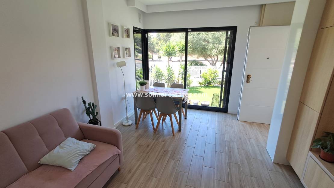 The villa boasts a private swimming pool set within a sleek, low-maintenance garden finished with artificial grass — an ideal space for relaxing, entertaining, or enjoying the Spanish sun. A large rooftop solarium provides even more space to soak up the Mediterranean climate and take in panoramic views.