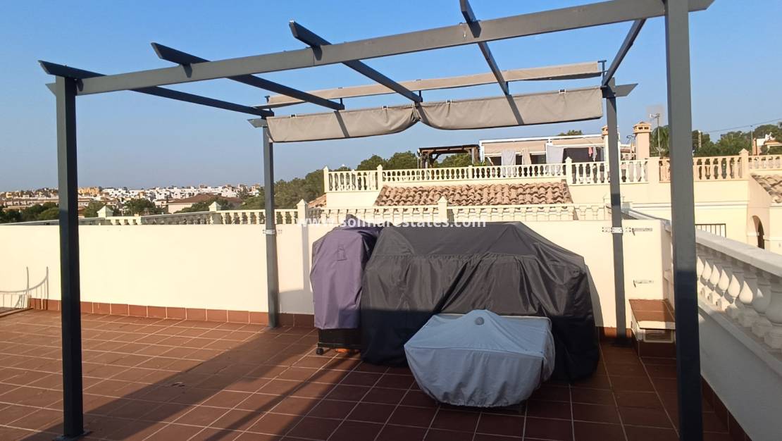 A spiral staircase leads up to a large private solarium, complete with a newly built gazebo for shaded relaxation on warm afternoons. From here, you can enjoy open views of the communal swimming pool and tennis court.