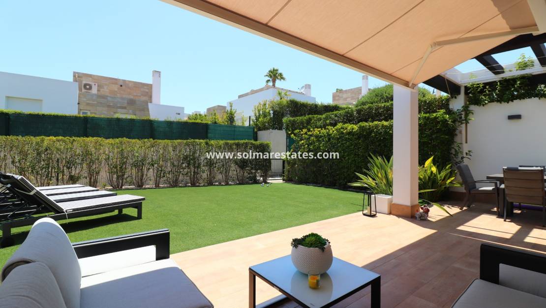 Set on a generous 448m² low-maintenance plot, the exterior includes a partly covered terrace, artificial grass area, off-road parking, and a carport. Additional features include air conditioning, an irrigation system, and access to two beautiful communal pools.