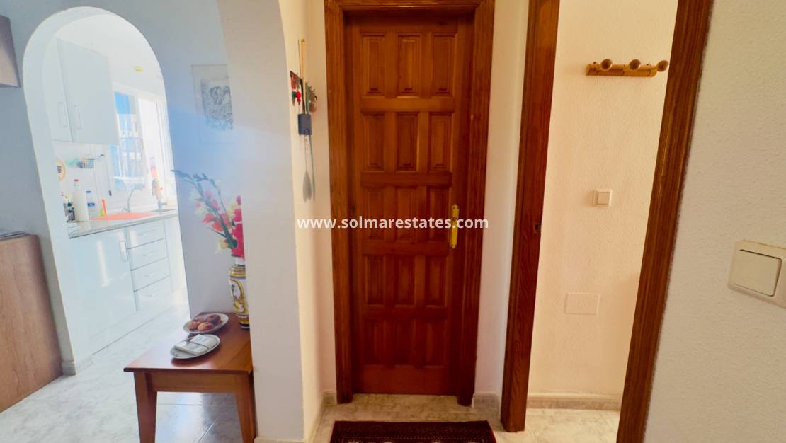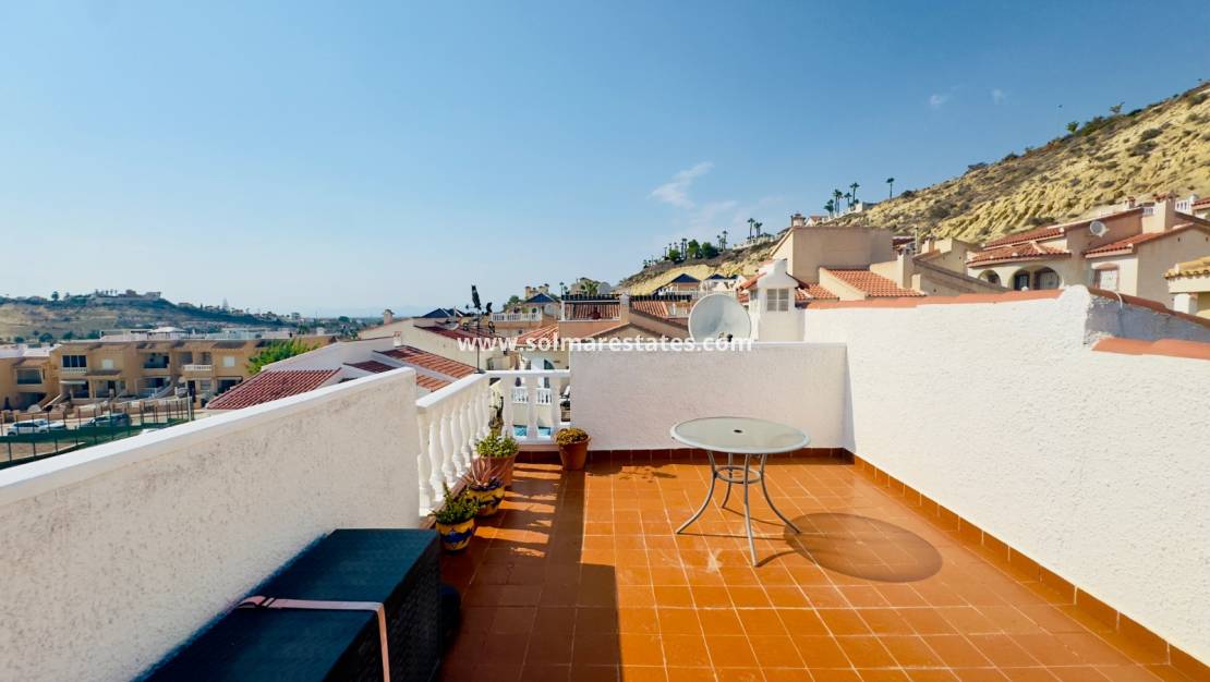 A private staircase leads to a spacious solarium with spectacular open views over the La Marquesa golf course, perfect for enjoying the Mediterranean climate and relaxing outdoors. The property also includes a private parking space on the plot.