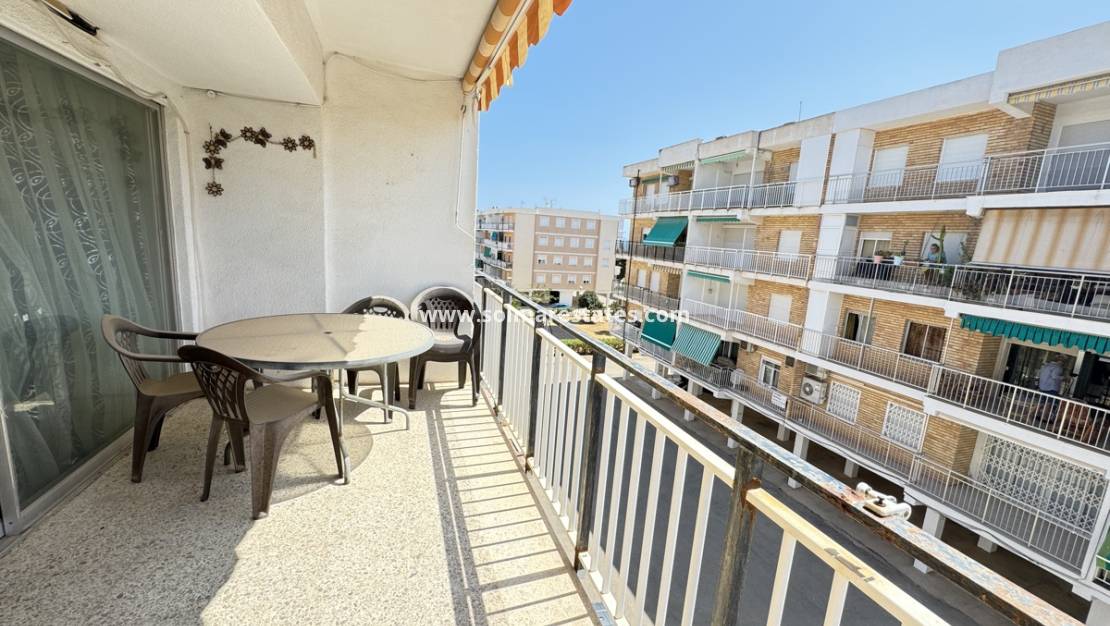The layout includes a spacious lounge with dining area, separate kitchen, bathroom, and two bedrooms with fitted wardrobes. Patio doors from the lounge open onto a long balcony, providing space to relax and enjoy the Mediterranean climate.