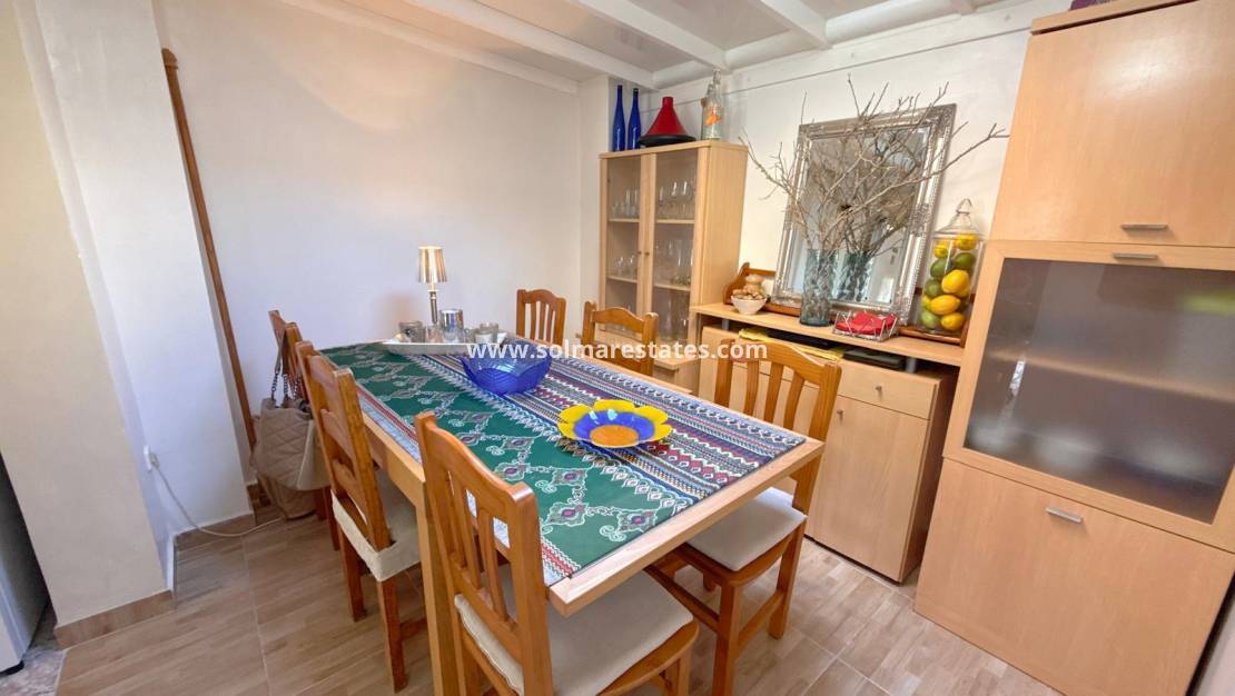 This well-located townhouse offers a sunny front terrace with off-road parking and a glazed porch leading into the lounge. The ground floor includes a guest WC, American-style kitchen with utility area, plus an additional covered room—ideal as a dining space or potential third bedroom.