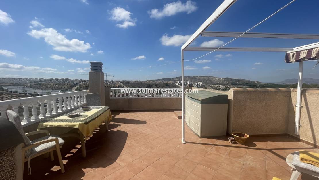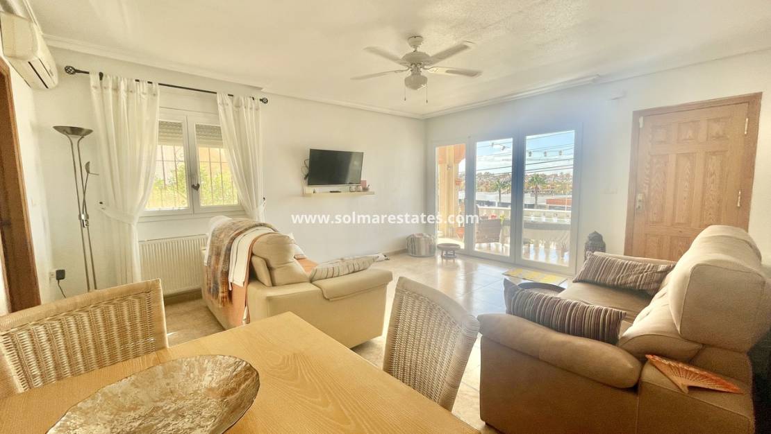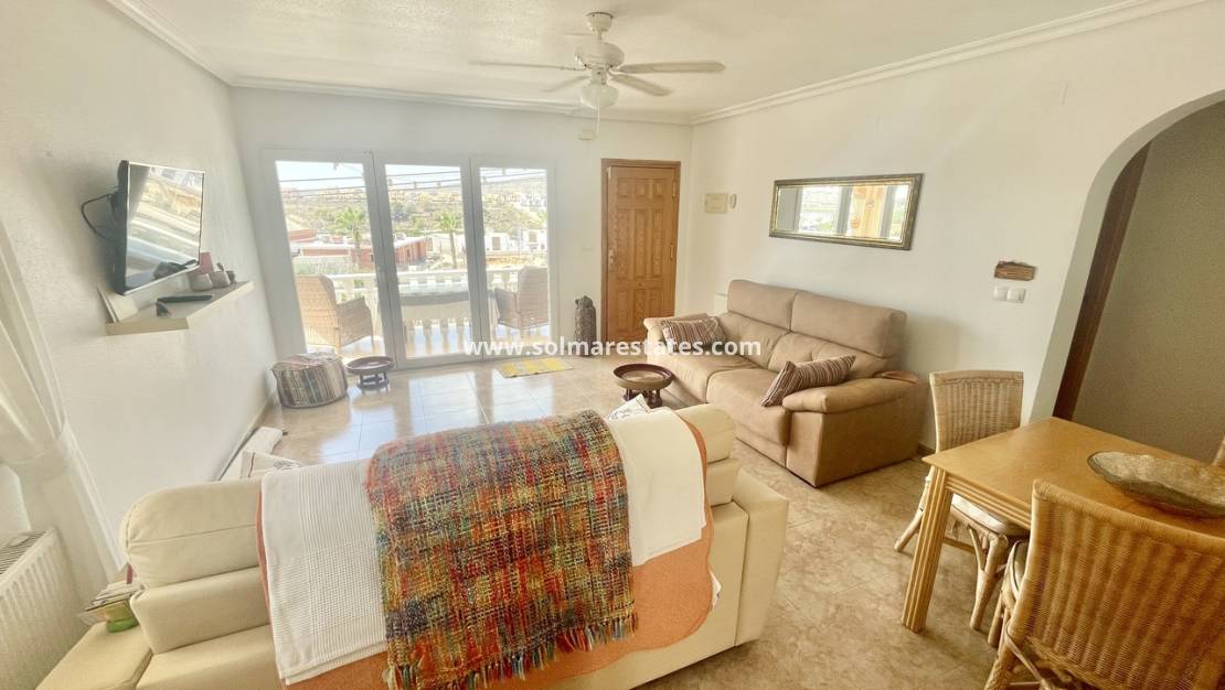 Inside, the home features a spacious living room with bi-fold doors, a separate fully equipped kitchen, and three well-proportioned bedrooms, including a master with en-suite. Additional highlights include air-conditioning, central heating, ample storage, and a private solarium with stunning views of the Callosa Mountain and surrounding countryside.