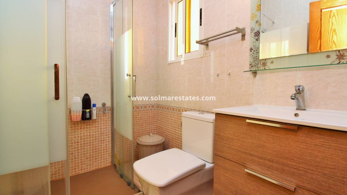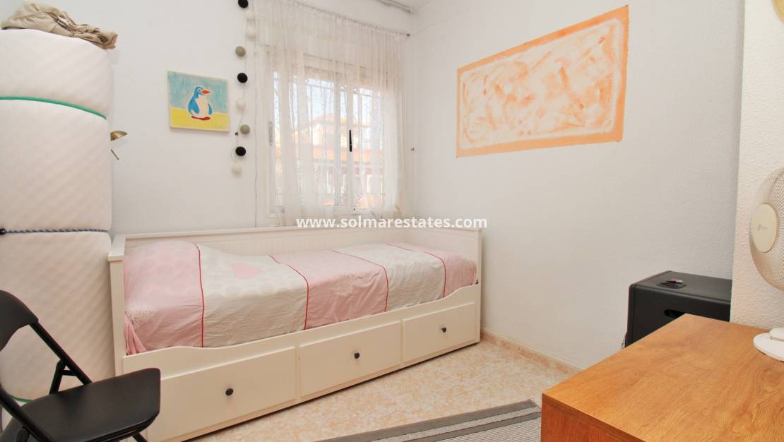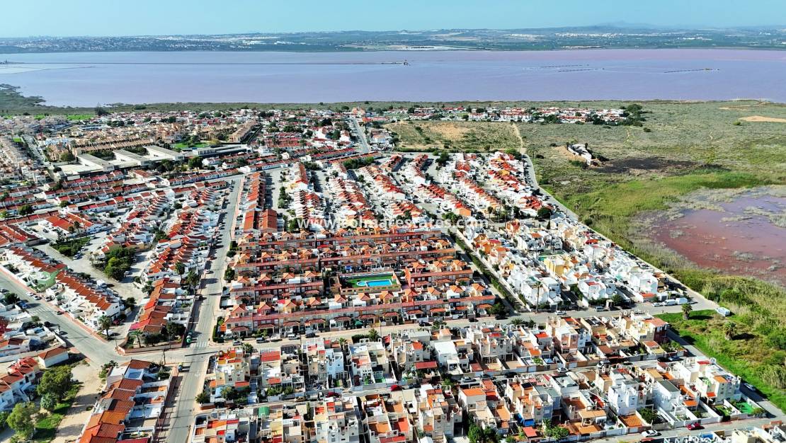 This attractive end-of-terrace townhouse is located in the well-maintained residential community of El Salado I, Torretas, Torrevieja. Set on a sunny corner plot, the property offers a tiled garden, off-road parking, a covered porch, and a pleasant outdoor seating area. The location is ideal, next to Torrevieja’s famous salt lakes and within walking distance of a supermarket, shops, bars, and restaurants, with beaches and the city centre just a few minutes away by car.