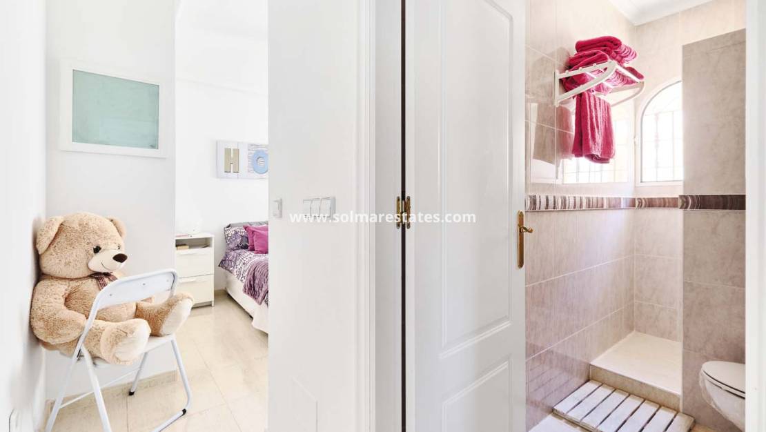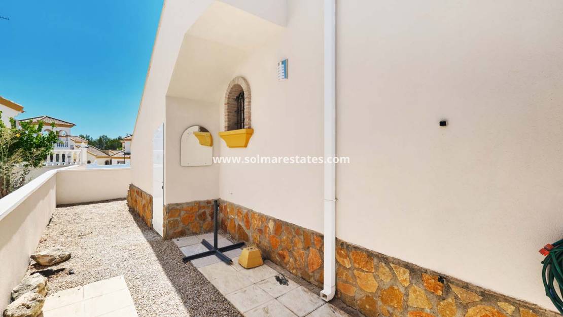 The exterior offers off-street parking and established planting. A storage room sits to one side of the villa. At the rear, an external staircase leads to a large private solarium, half of which is shaded. The solarium includes a second storage room and a shower and enjoys wide open views.