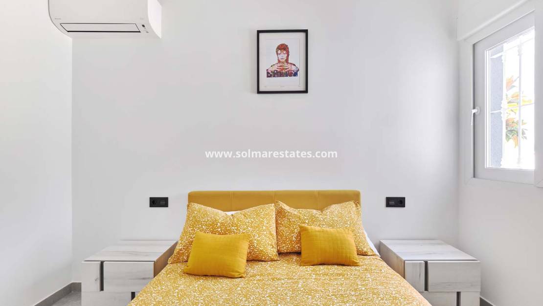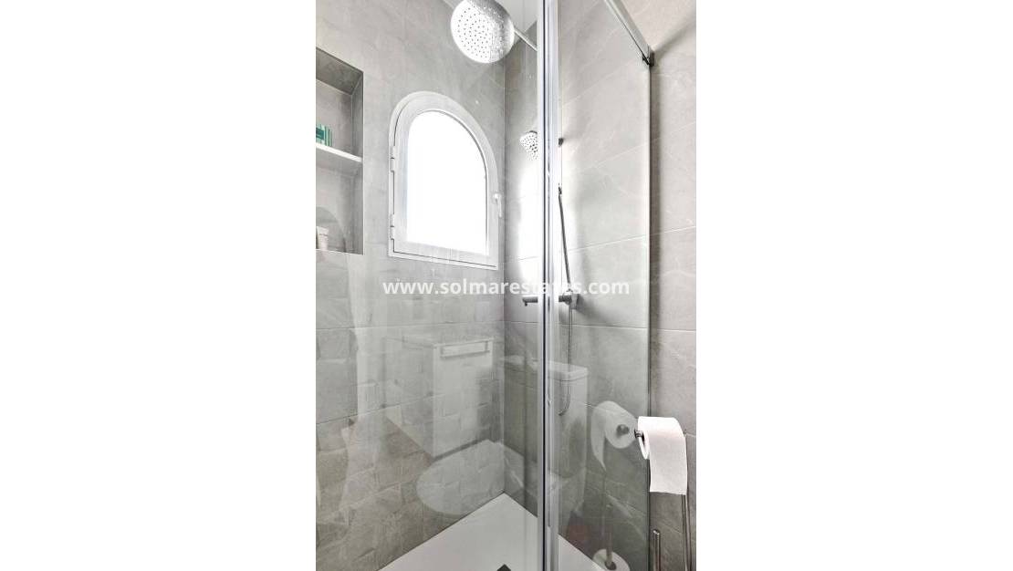 A hallway from the living area leads to two double ground-floor bedrooms, both good-sized rooms with built-in wardrobes and newly installed hot/cold air conditioning units. At the end of the hallway is a beautifully modernised family bathroom with a spacious walk-in shower.