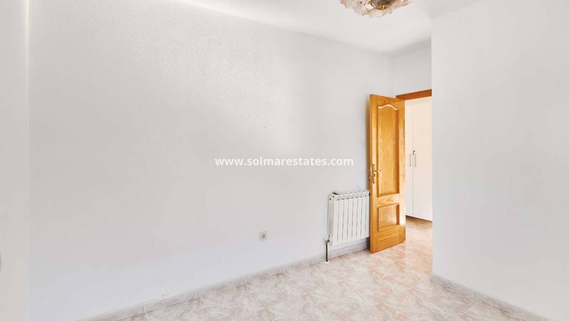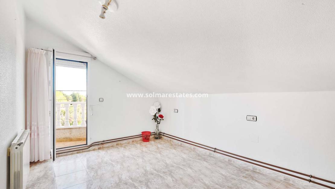 Entering the property via the pedestrian gate, a staircase leads up to a bright glazed sunroom and the main floor of the villa. This level features a spacious living room with fireplace, a good-sized separate kitchen with pantry, two family bathrooms and four double bedrooms, two of which include built-in wardrobes. The layout on this floor is very flexible and could easily be reconfigured to create larger bedrooms or an open-plan living space if desired.