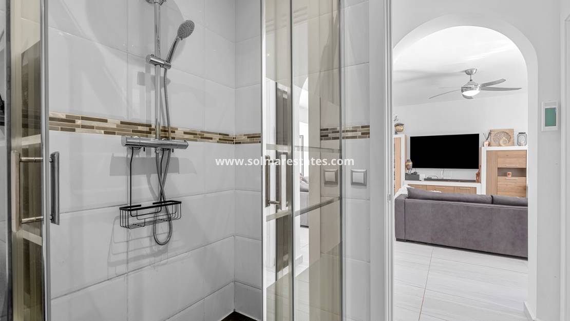 The exterior of the property has been designed to take full advantage of the Costa Blanca climate. It features a private 8 x 4 metre swimming pool and a fully equipped outdoor kitchen, making it an ideal setting for outdoor dining and social gatherings. The southwest orientation ensures sun throughout the day, while the surrounding plot offers ample space for landscaped gardens, relaxation areas, or further development.