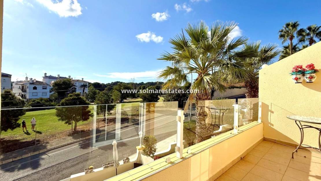 There are two double bedrooms, including a master with an en-suite bathroom, providing privacy and comfort for family or guests. Additional features include a fully fitted family bathroom, ample storage, and access to a roof terrace with panoramic views of the surrounding area and golf courses.
